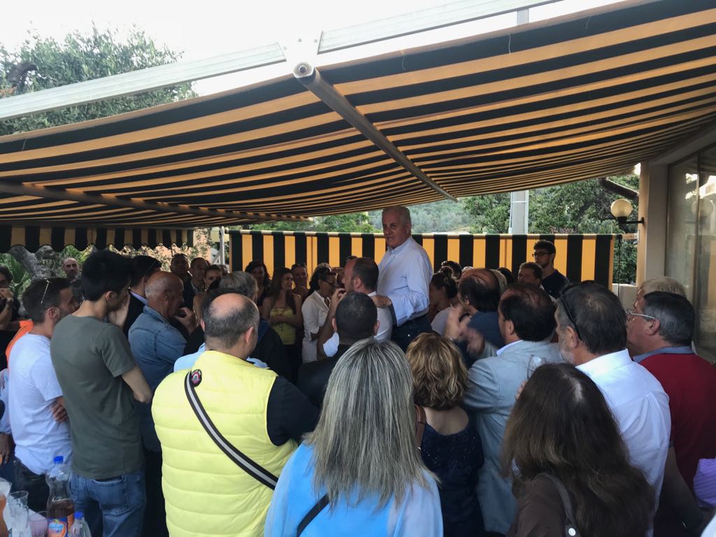 Nel suo piccolo comizio-show, in piedi sulla sedia, Scajola ha scaldato la platea invitando simpatizzanti e sostenitori a continuare a mantenere “Questo meraviglioso spirito inclusivo e sorridente, per cui siamo aperti a tutti e contro nessuno”.