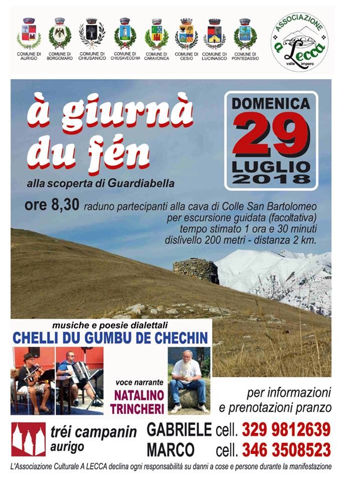 Aurigo. L’ Associazione culturale”A Lecca”, che promuove la valorizzazione di storia, cultura e tradizione della valle impero, in collaborazione con l’ associazione Trei Campanin di Aurigo organizza nella giornata di domenica 29 luglio “A giurna’ du fen” alla scoperta di Guardiabella.