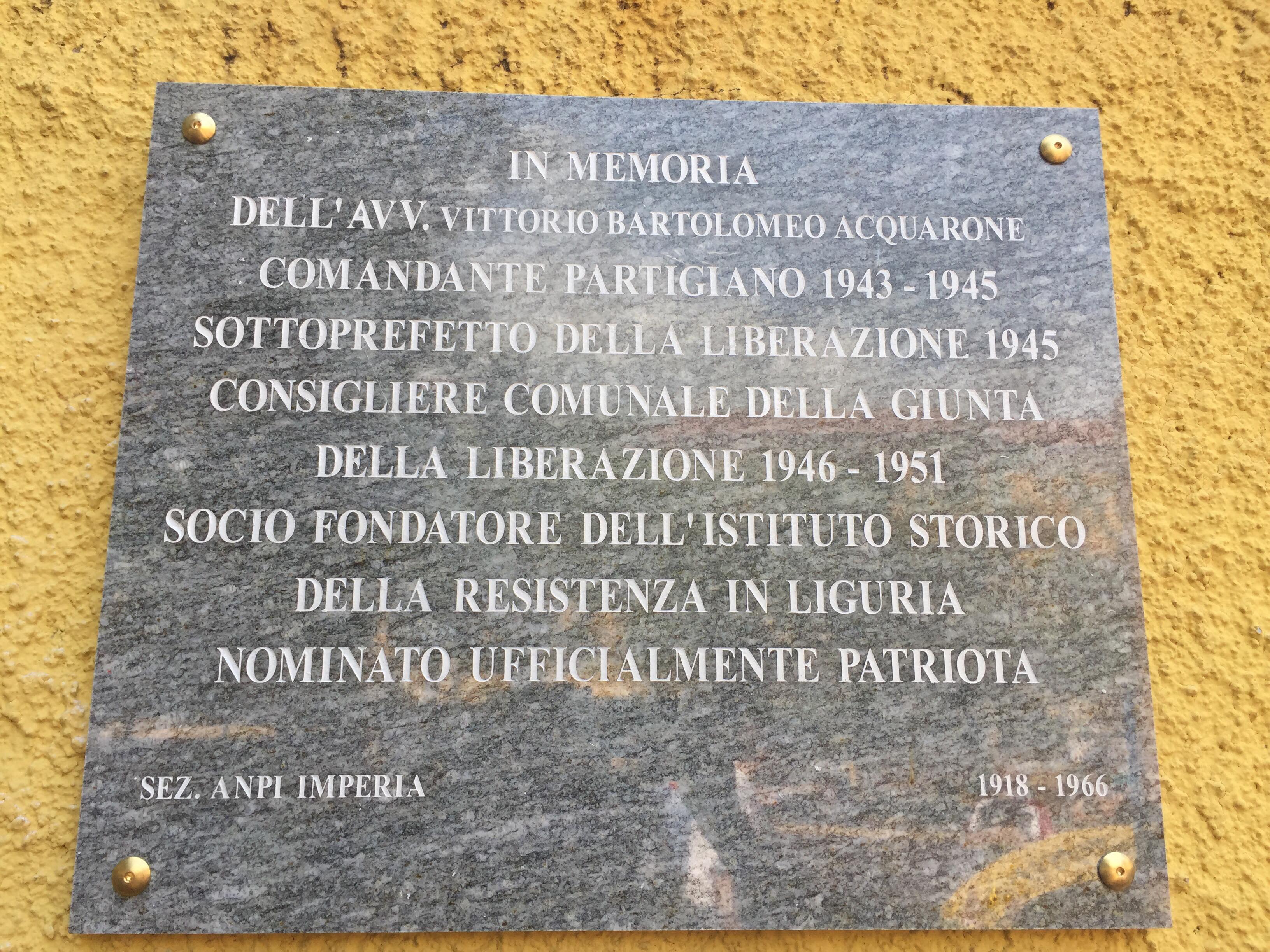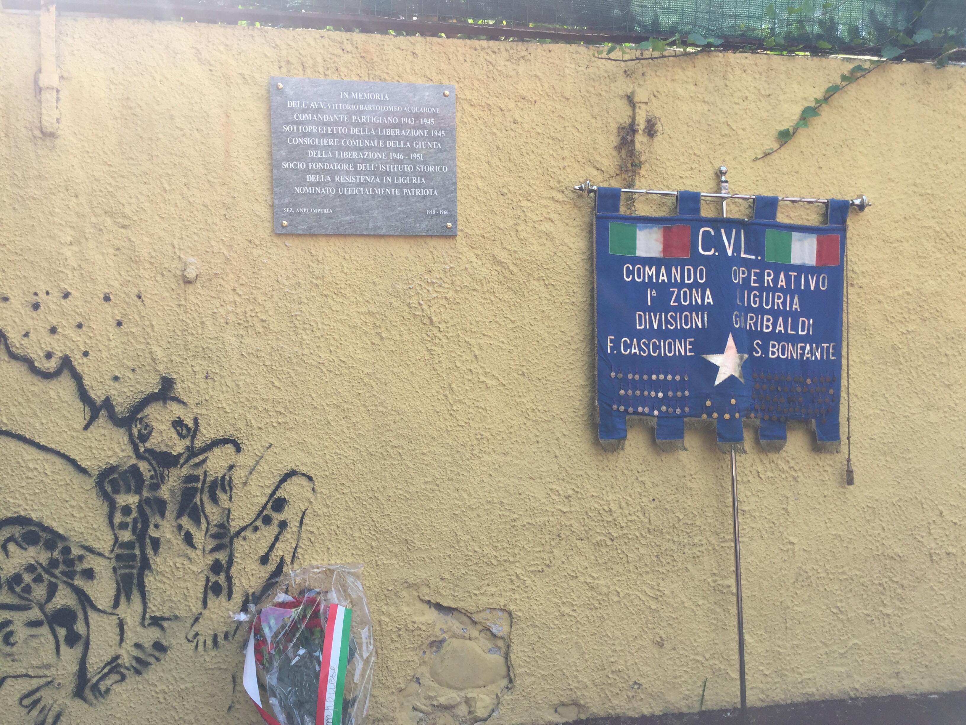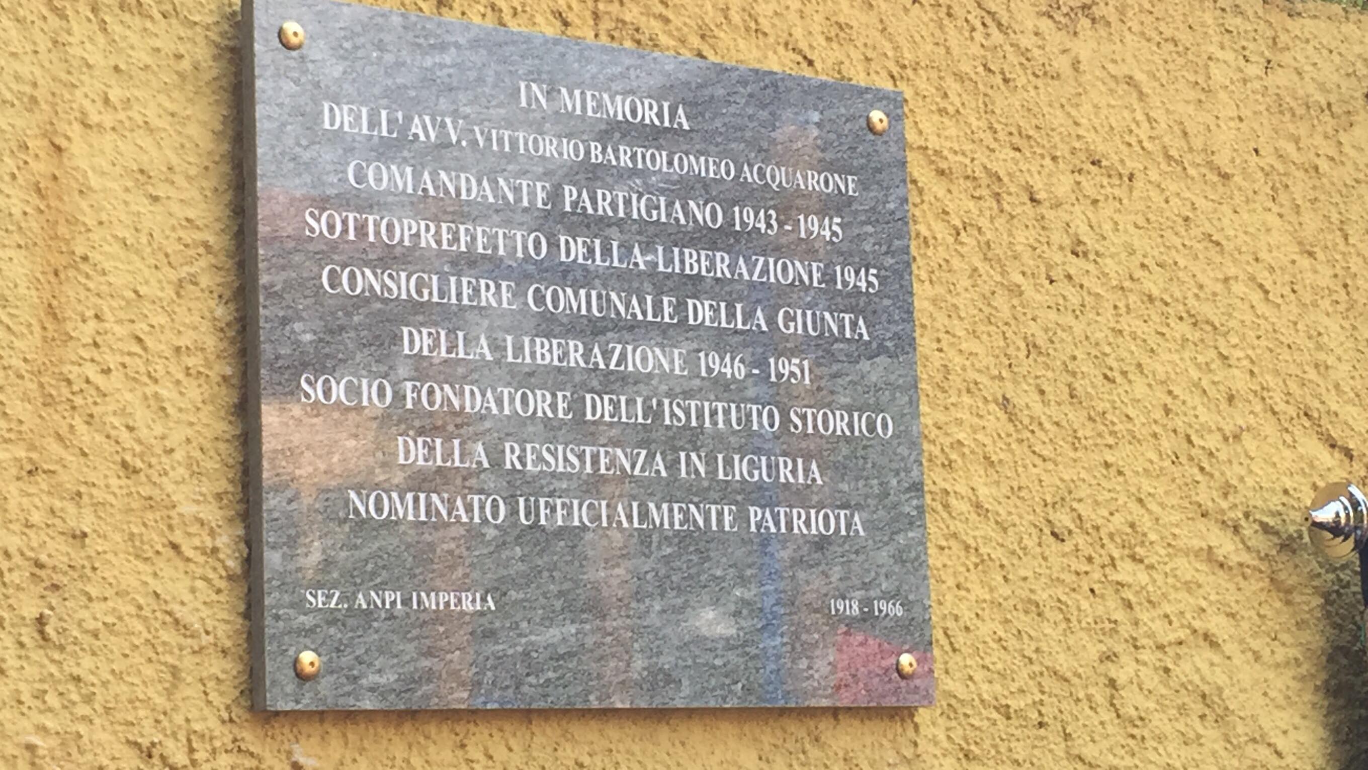 A due anni di distanza dall`atto vandalico che distrusse la lapide in memoria del comandante partigiano l’Avv. Vittorio Bartolomeo Acquarone, ubicata presso i giardini di Largo Ghiglia, questa mattina, alla presenza del nipote, del Presidente della Provincia Fabio Natta, del partigiano Neri Valcado, del presidente provinciale dell`Anpi Ugo Mela, dell’assessore alla cultura del comune di Imperia Marcella Roggero, è stata posizionata una nuova lapide all’interno di uno dei due parchi giochi. Presenti anche esponenti della Prefettura, della Polizia di Stato e della società civile oltre che alcuni partigiani.