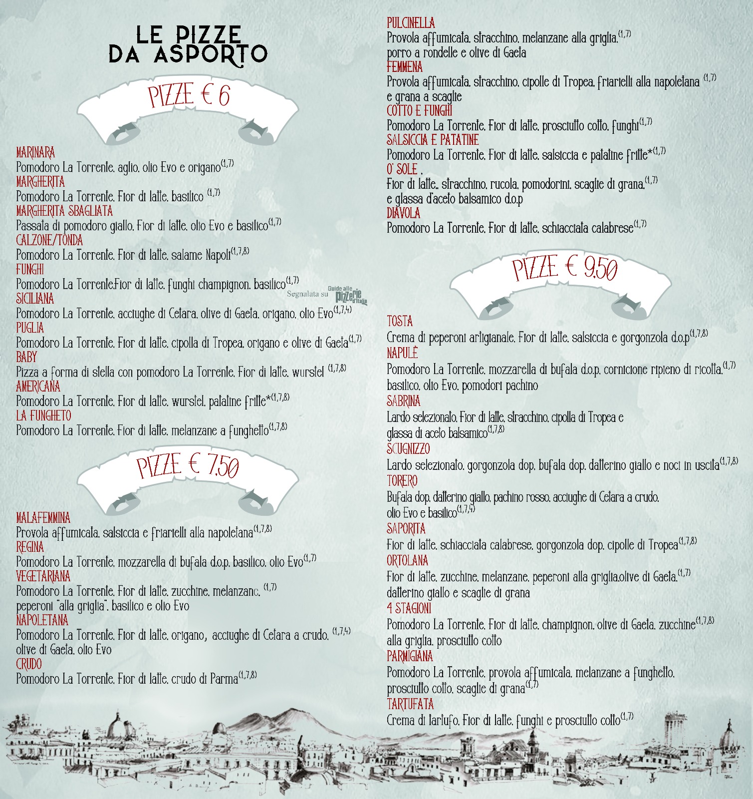 Alle specialità delle pizze tradizionali si aggiungerà quella “a portafoglio”, di una taglia leggermente più piccola comoda da mangiare per strada. “La pizza a portafoglio ha una storia molto lunga. La pizzeria che si vanta di averla inventata si trova a Port’Alba, vicino piazza Dante, ed è stata fondata nel 1738 a Napoli” .A completare il menù alcuni dolci classici napoletani: babà, babà bigusto, pastiera e zeppole di San Giuseppe.