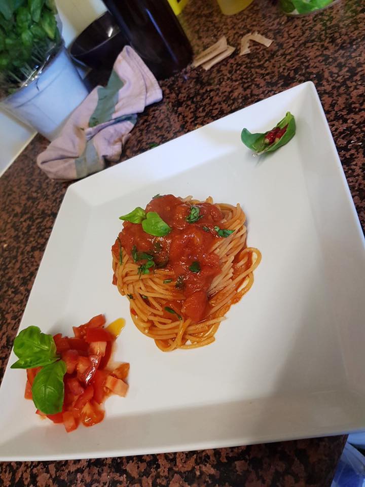- Tagliolini di borragine con ciuffi di calamari e pachino