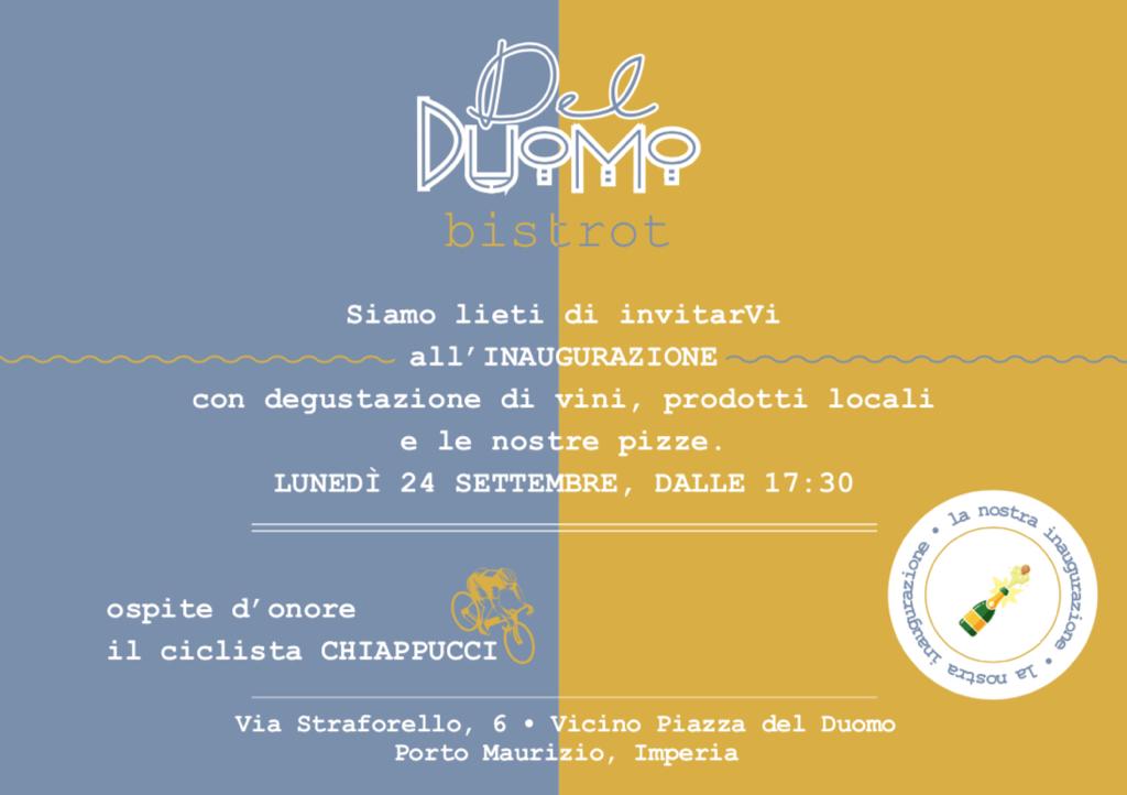 Imperia. Inaugurerà lunedì 24 settembre il “Bistrot Del Duomo”, in via Strafforello 6 ( angolo piazza Duomo di Porto Maurizio di fronte alla Questura). A partire dalle 17.30 si festeggerà l’apertura del nuovo locale gustando alcune specialità fra cui le pizze, curate da Luca pizzaiolo dell’Osteria Pizzeria Le Macine di Dolcedo, e il taglio del nastro sarà affidato al campione di ciclismo Chiappucci “El Diablo”.