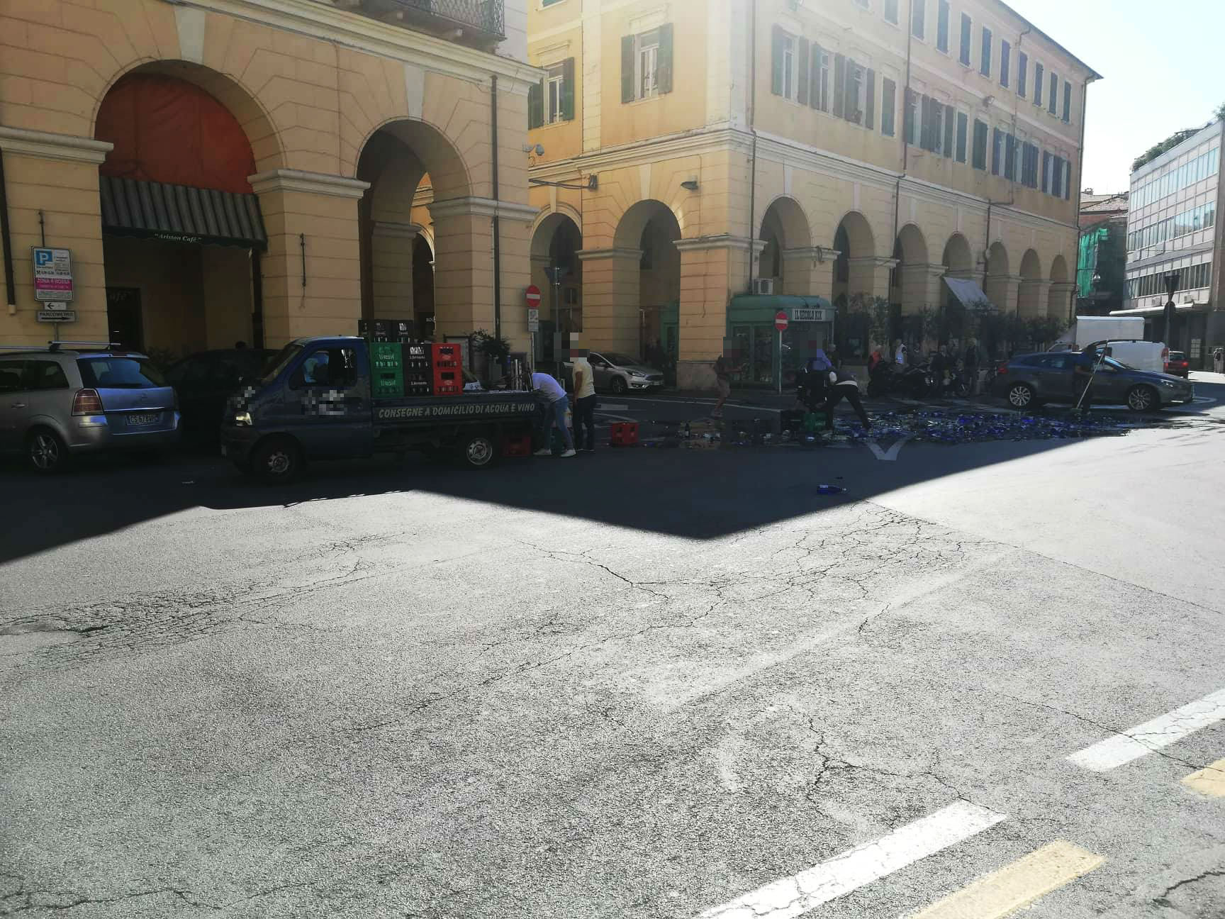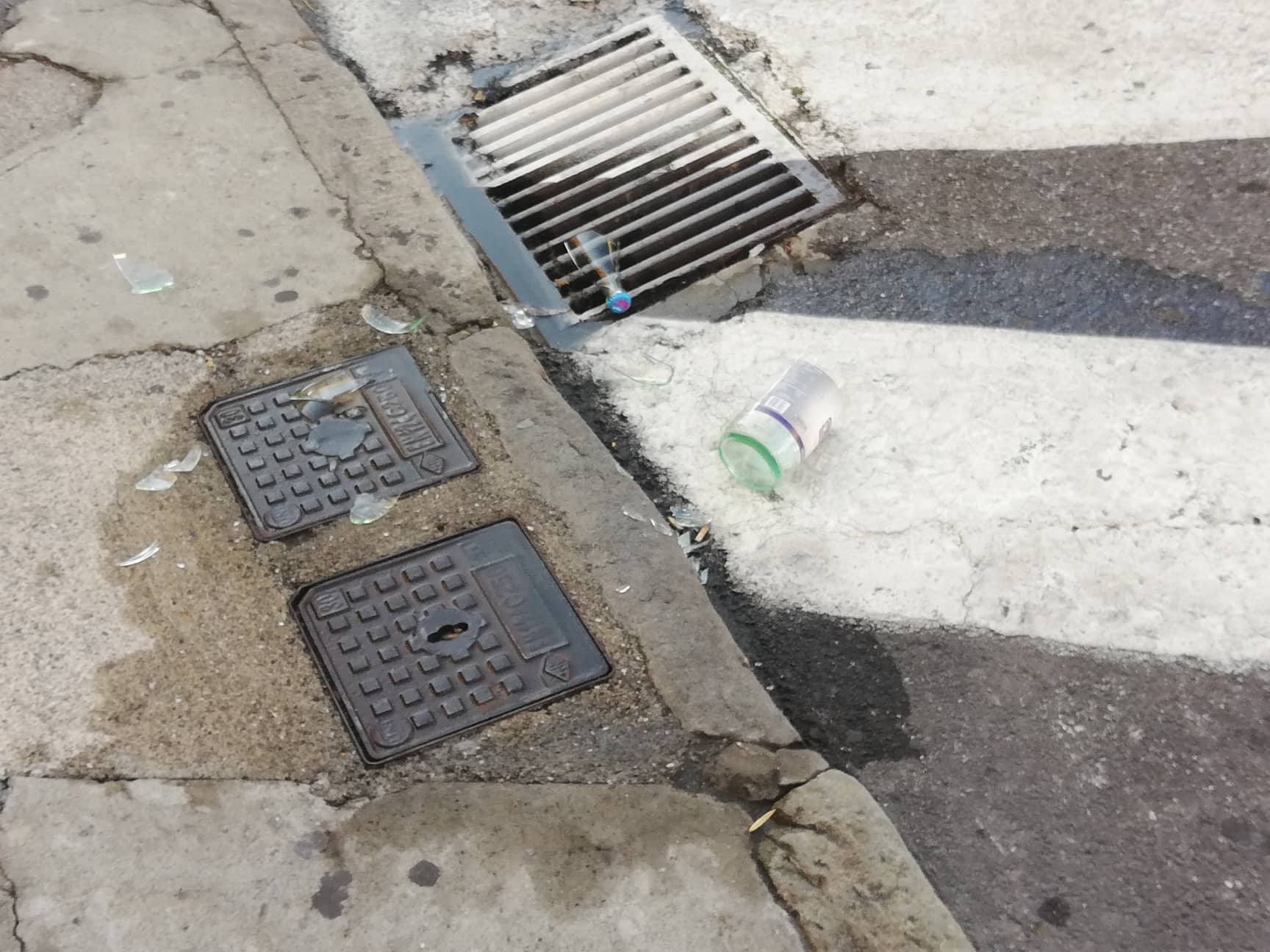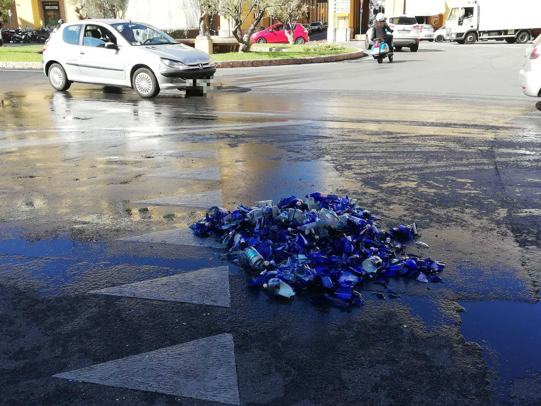 A contatto con l’asfalto le bottiglie si sono frantumate e a terra si è formata una distesa di pezzi di vetro.