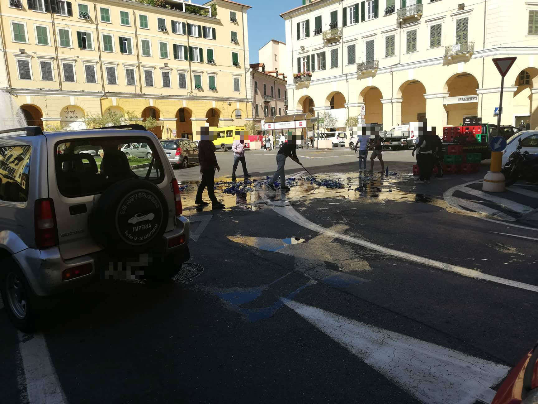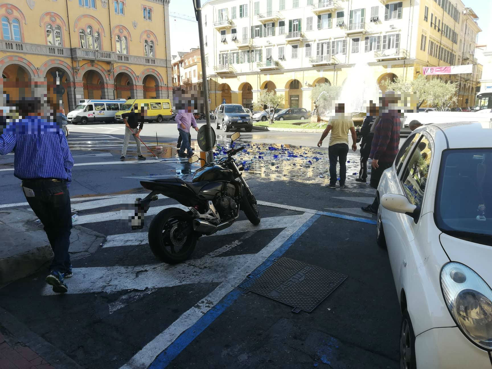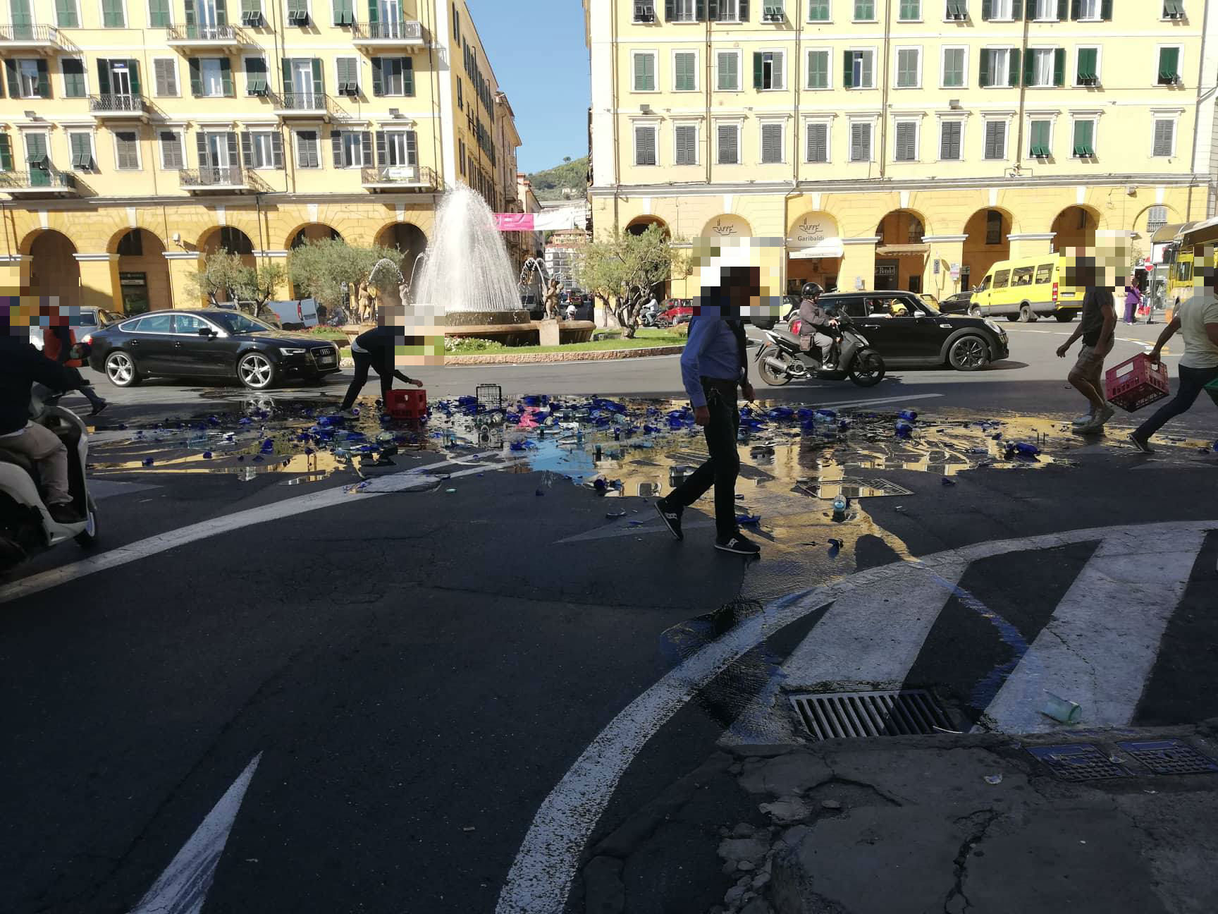 A contatto con l’asfalto le bottiglie si sono frantumate e a terra si è formata una distesa di pezzi di vetro.
