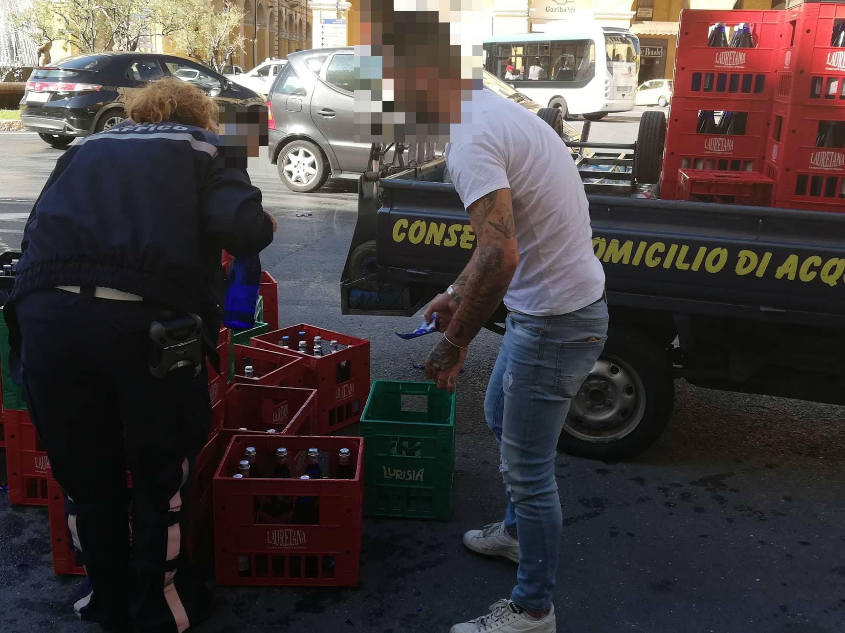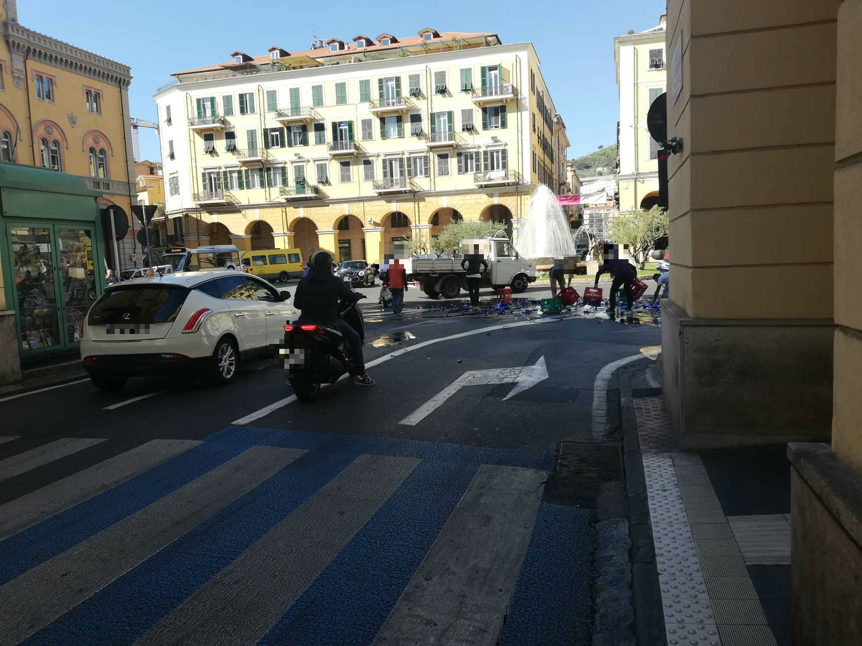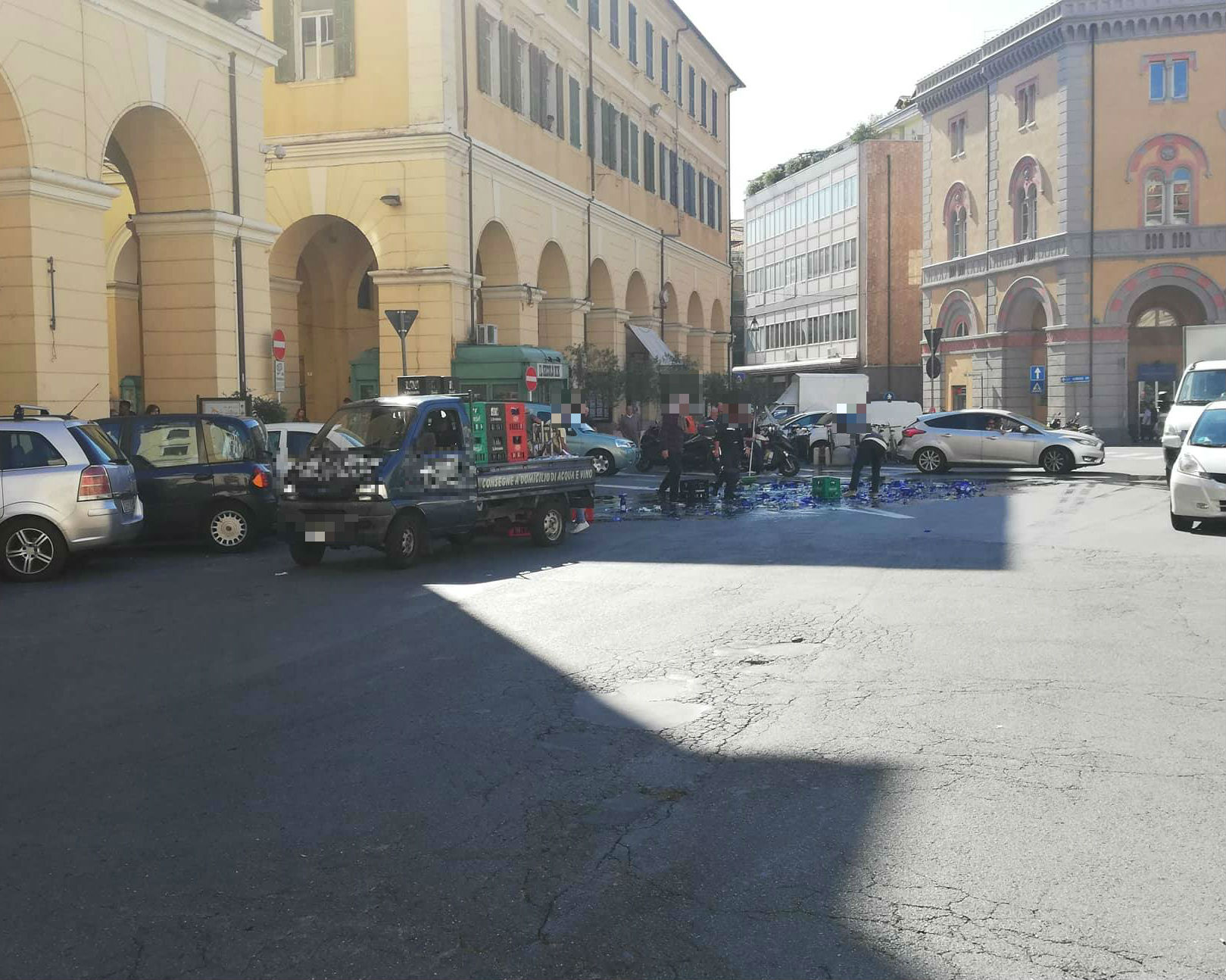 Curioso incidente questa mattina in Piazza Dante. Un camioncino, per cause ancora in fase di accertamento, ha perso parte del proprio carico di bottiglie di vetro.