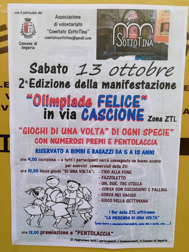 Si è tenuta questa mattina, nell’isola pedonale di via Cascione a Imperia, la seconda edizione di “Olimpiade Felice – Giochi di una volta di ogni specie”, manifestazione organizzata dall’associazione di volontariato “Comitato SottoTina” e dedicata a bambini e ragazzi dai 5 ai 13 anni.
