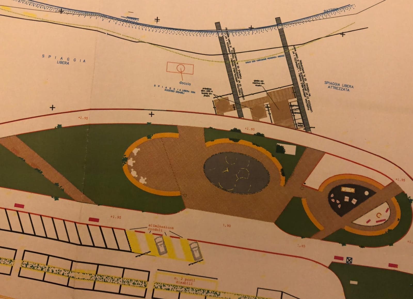 Ci sarà una pedana di 20 mq completamente ombreggiata da un gazebo, 2 cabine e un bagno per disabili, 2 pedane più piccole (9 mq l’una) con gli ombrelloni, 2 scivoli con 2 sedie “job” per entrare in acqua e posti auto riservati ai disabili in prossimità del lido.