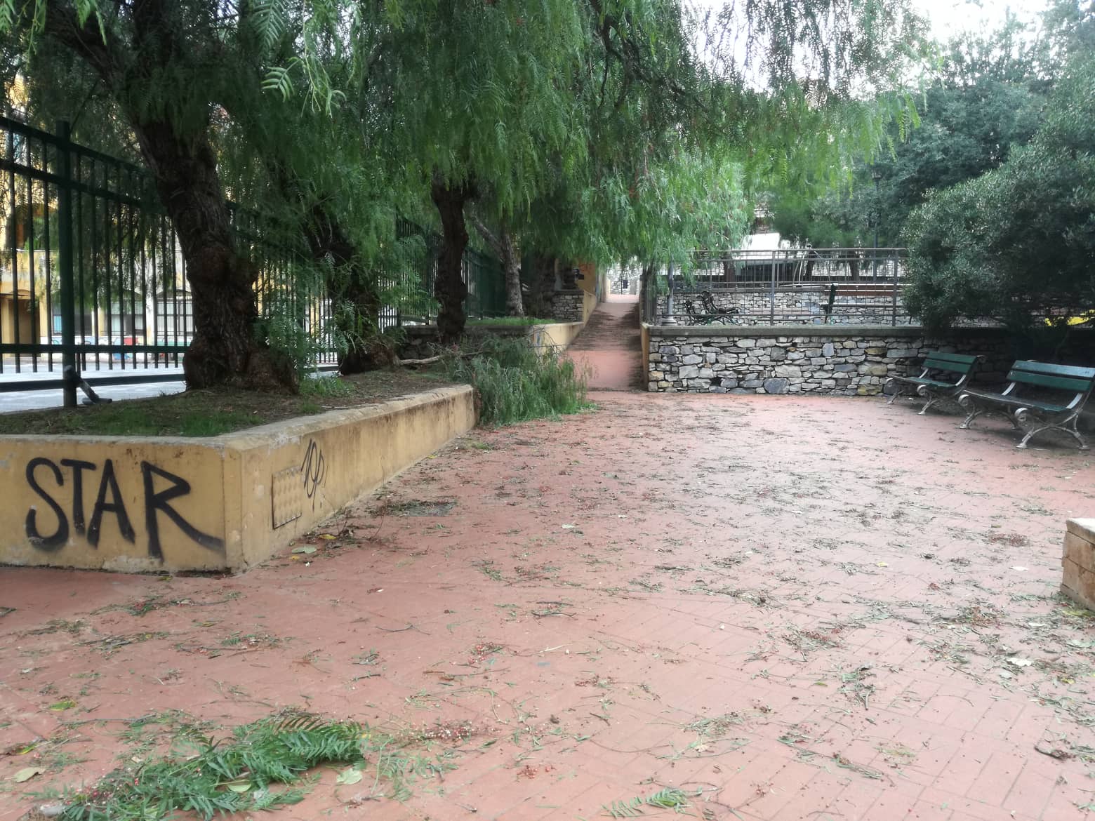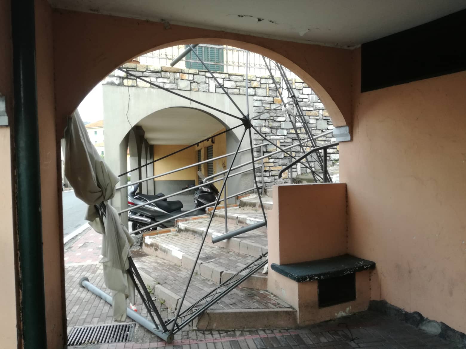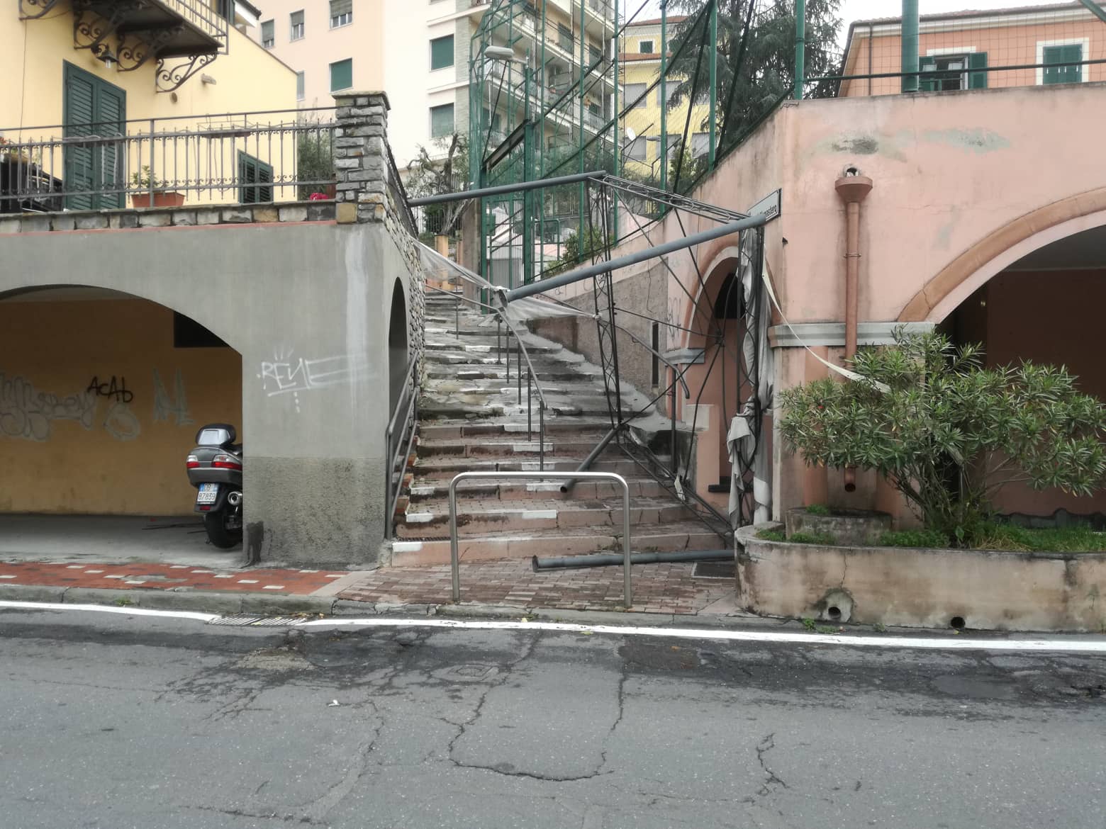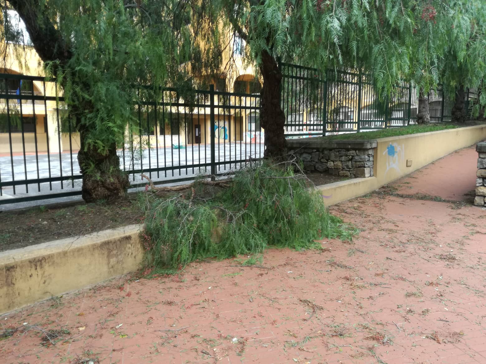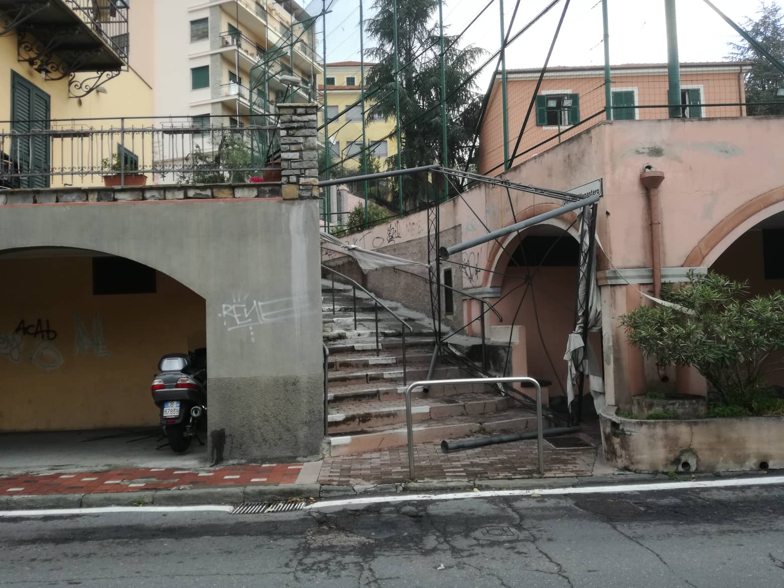 Alberi crollati, rami e foglie sparsi ovunque, impalcature pericolanti, motorini a terra. Questo e molto altro si presenta a Oneglia, in particolare nella zona di Largo Ghiglia e aree limitrofe.