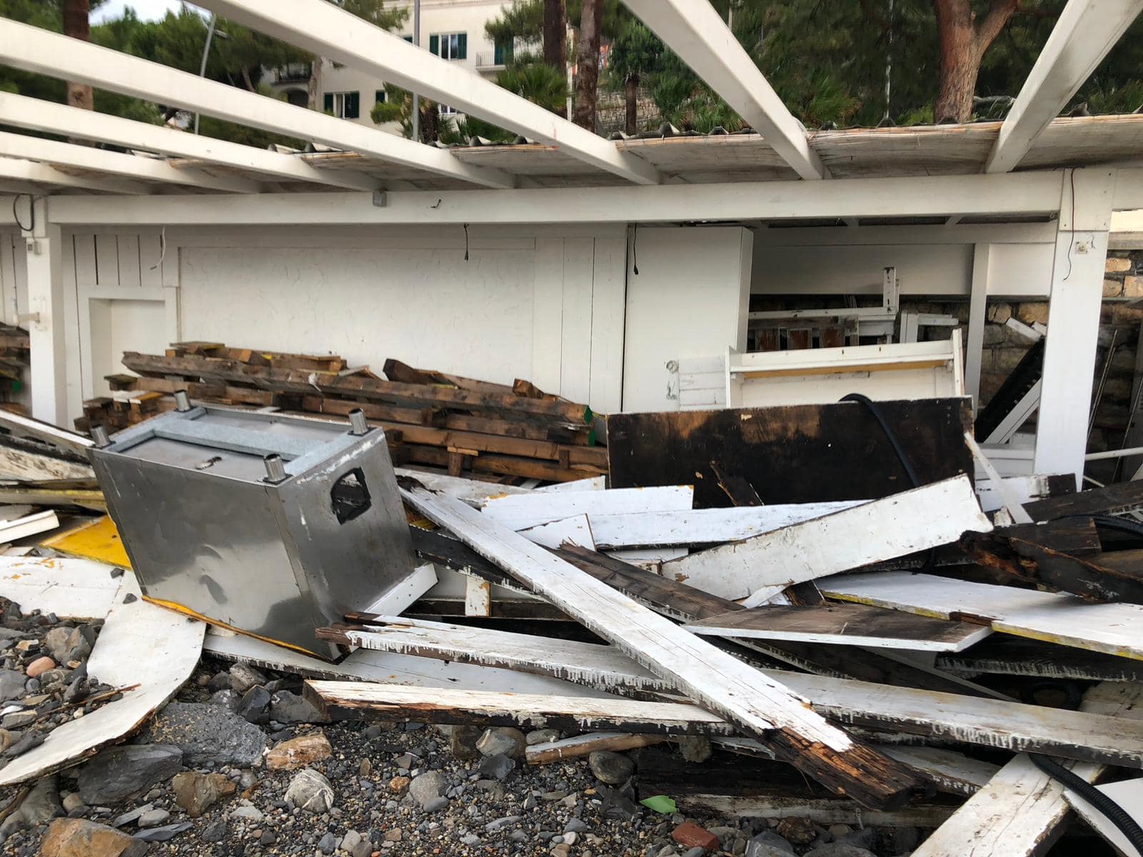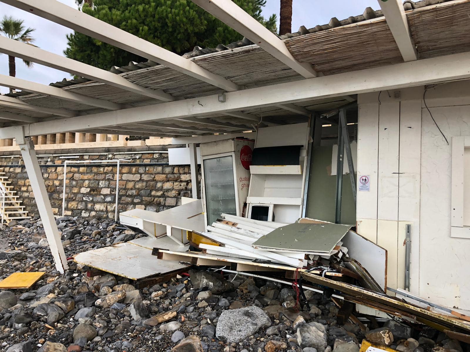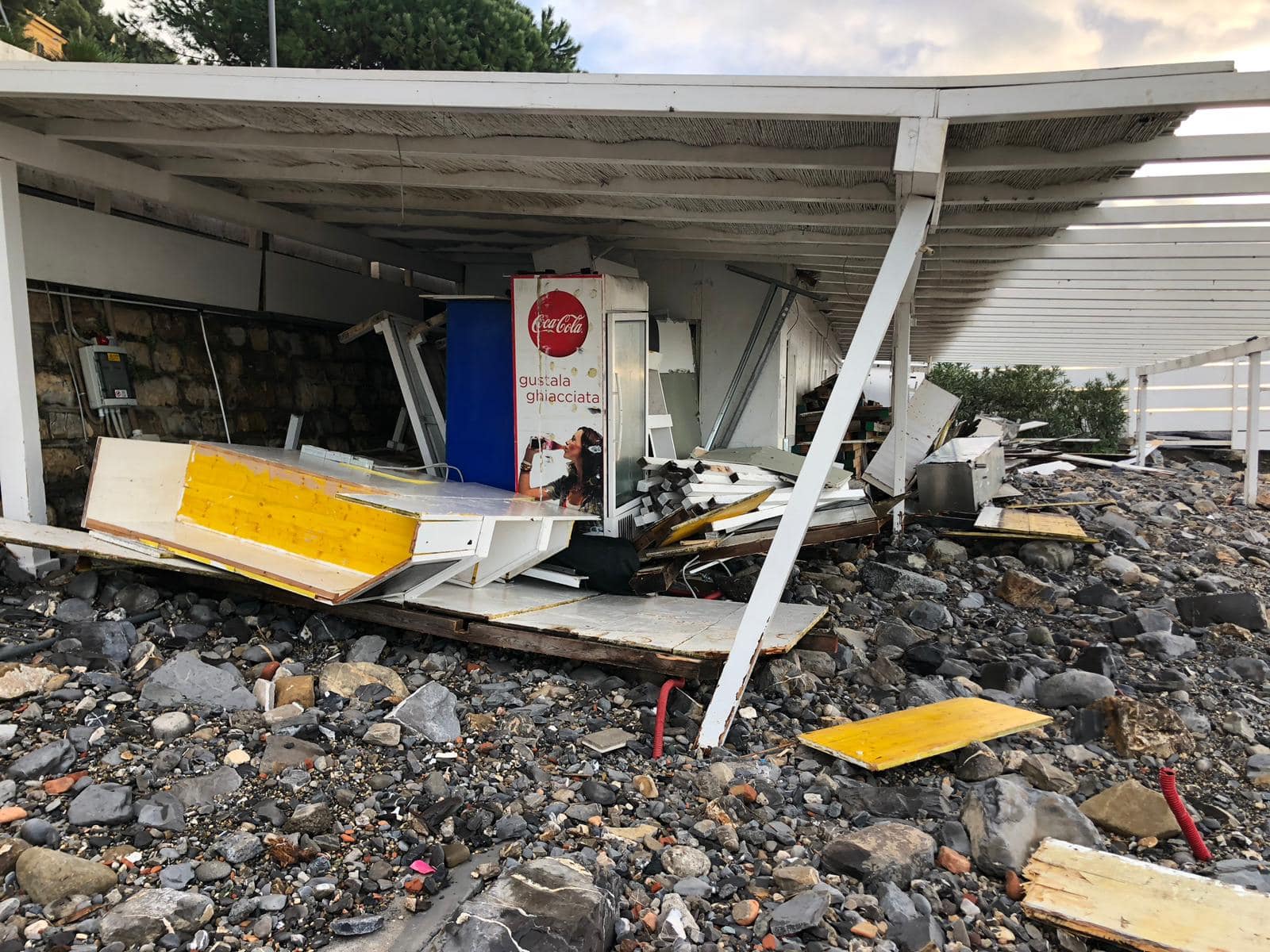 La struttura della spiaggia “Koko Beach” a Borgo Peri è stata divelta in più parti dal vento e l’intera area è stata ricoperta da detriti e fango.