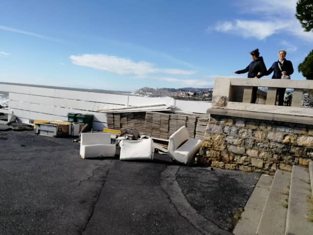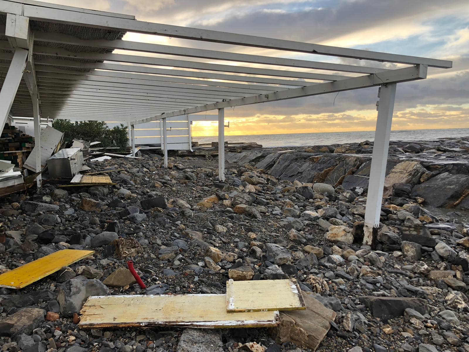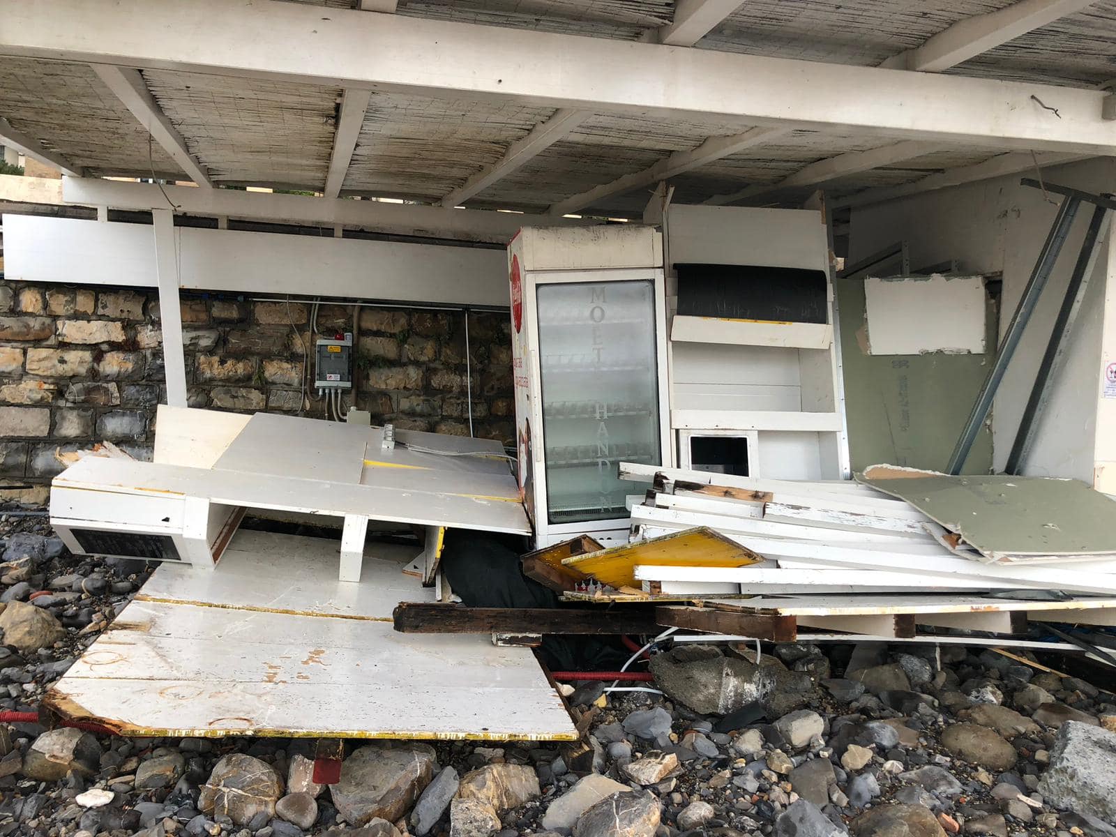 La struttura della spiaggia “Koko Beach” a Borgo Peri è stata divelta in più parti dal vento e l’intera area è stata ricoperta da detriti e fango.