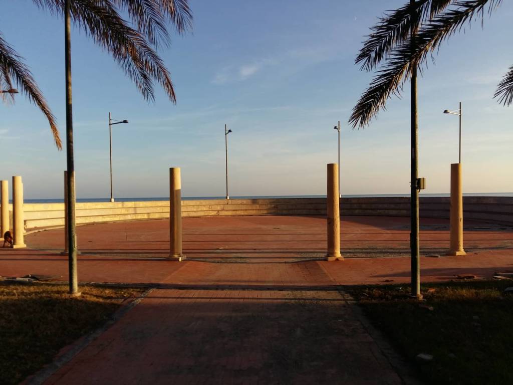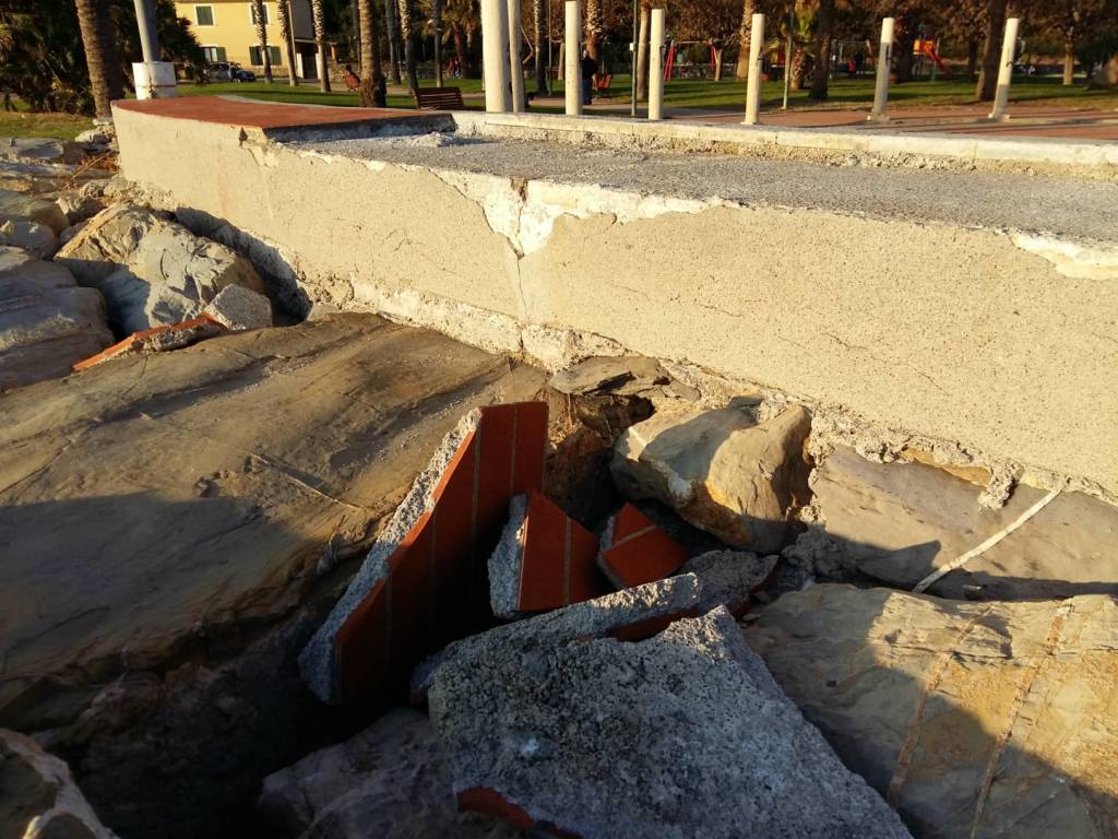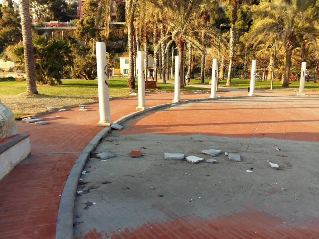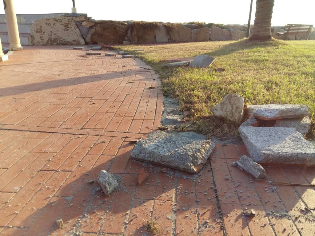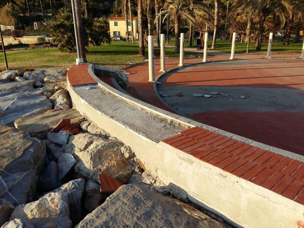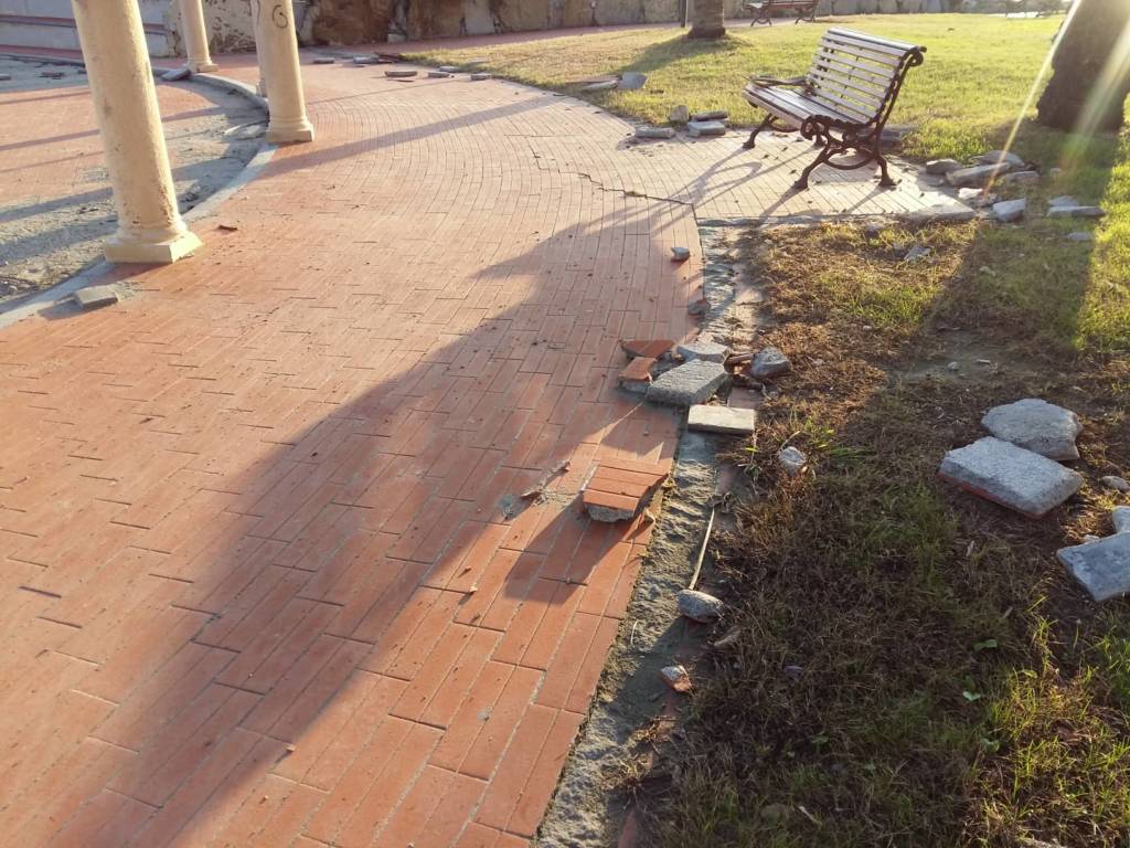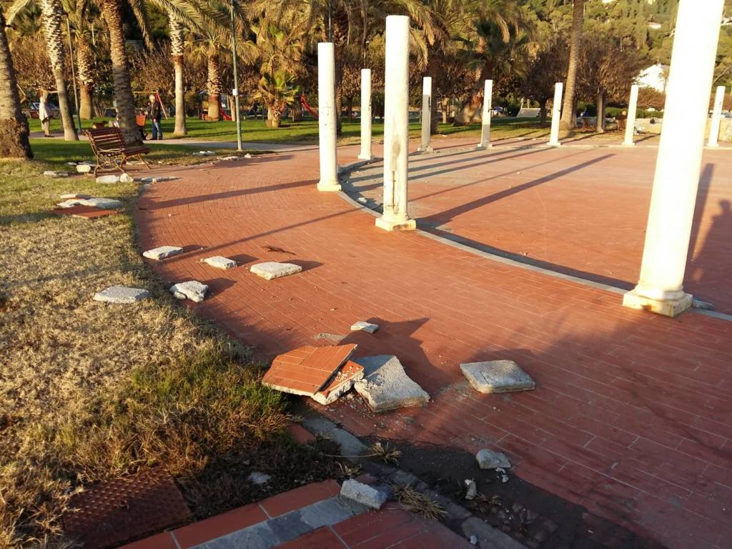 Molte zone sono già state sistemate e pulite, e dove non è possibile, si è provveduto a recintare l’area per renderla inaccessibile. Qui al parco, invece, ci sono ancora sparse per terra le lastre di pavimentazione che la forza del mare ha distrutto.