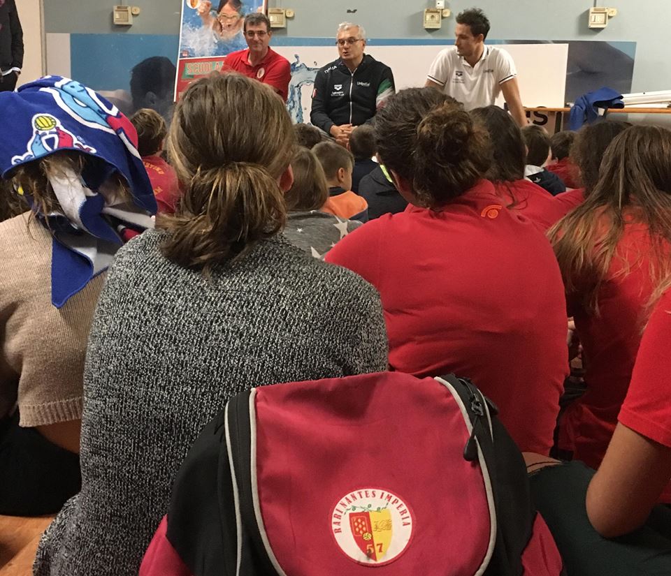 A partire da lunedì sera quando i settori giovanili della Rari Nantes Imperia, accompagnati da tanti genitori, hanno ascoltato le bellissime parole del CT Campagna e di Capitan Matteo Aicardi. Una vera lezione di sport e di vita: i due protagonisti azzurri hanno svelato molti segreti, dato consigli e regalato alcuni ricordi. Hanno raccontato l’avventuroso bronzo olimpico di Rio, Campagna si è rivolto agli allenatori mentre Aicardi ha ricordato con affetto i suoi anni ad Imperia.