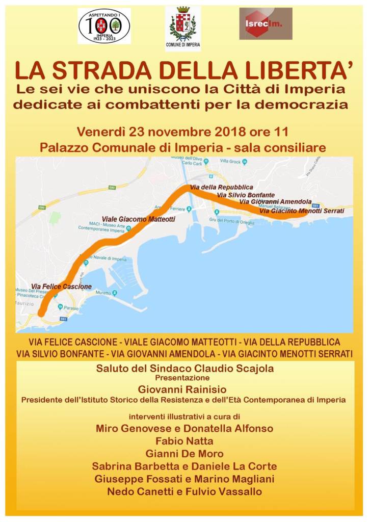Nella mattina di oggi, l’ISRECIm (Istituto Storico della Resistenza e dell’Età Contemporanea di Imperia), con il patrocinio del Comune di Imperia, ha promosso, nell’ambito del programma “Aspettando i 100 – 1923-2023” l’iniziativa dal titolo “La strada della libertà. Le sei vie che uniscono la Città di Imperia dedicate ai combattenti per la democrazia”, proprio per ricordare i personaggi a cui sono dedicate queste importanti vie cittadine.