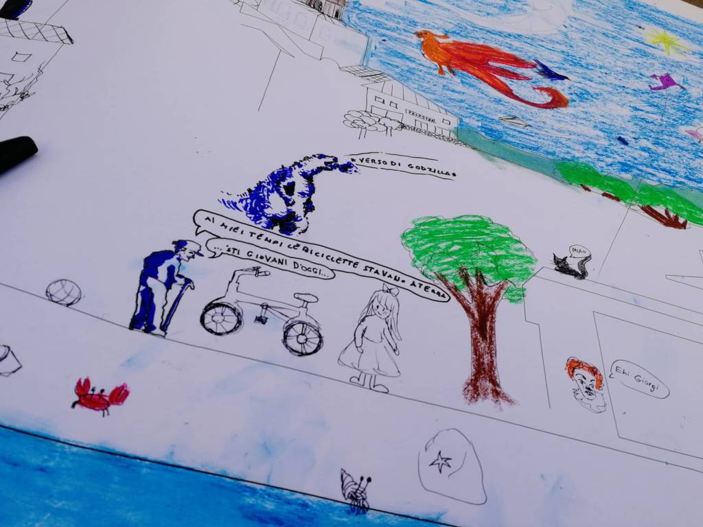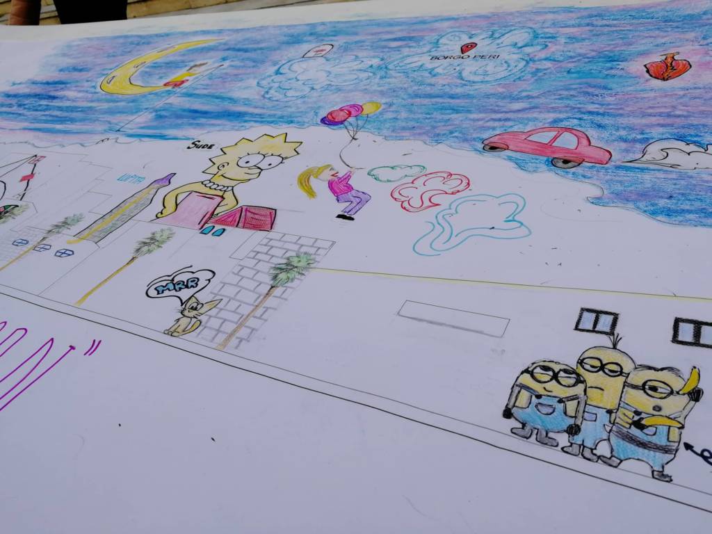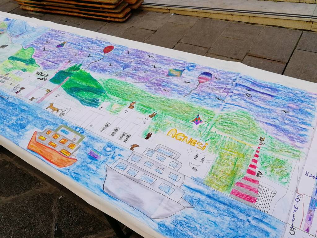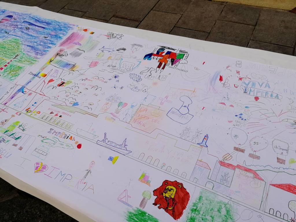 Abbiamo preparato uno skyline di Imperia, che sarebbe Imperia vista dal mare, lungo circa 30 metri. Ogni classe aveva il compito di disegnarne una porzione. Un compito che non era solo una riproduzione ma una rappresentazione artistica e fantasiosa della città.