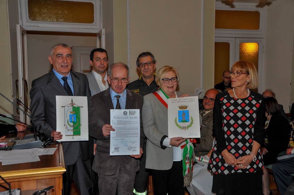 Il Prefetto, nell’occasione, ha consegnatolo Stemma e del Gonfalone conferiti, con Decreto del Presidente della Repubblica, all’Unione dei Comuni della Valle Argentina ed Armea di cui fanno parte i Comuni di Bajardo, Ceriana, Molini di Triora, Montalto-Carpasio e Triora.