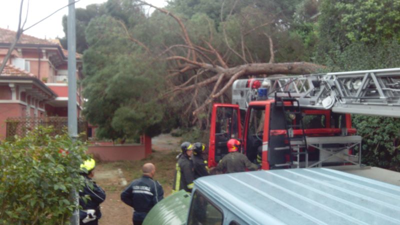Sul posto sono intervenuti i Vigili del Fuoco che hanno chiuso la strada al traffico e hanno iniziato le operazioni per la rimozione dell’enorme tronco che occupa tutta la carreggiata. A quanto pare il crollo sarebbe dovuto alle piccole radici tipiche del pino marittimo in confronto al grande tronco e alla folta chioma, senza considerare poi il terreno molto franoso di tutta l’area.
