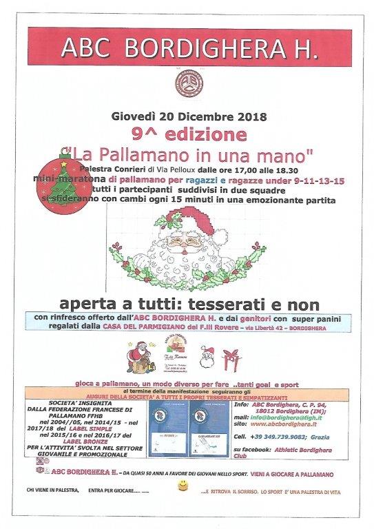 L’ABC Bordighera chiude un impegnativo, ma pieno di soddisfazioni, 2018 con la 9^ edizione de “LA PALLAMANO IN UNA MANO”, manifestazione che si è svolta giovedì 20 dicembre alla palestra Conrieri di via Pelloux.