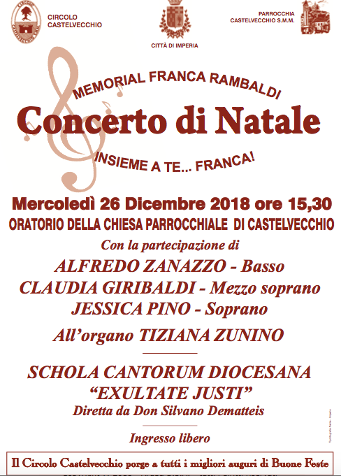 Il Concerto di Natale, organizzato dal Circolo Castelvecchio in collaborazione con la Parrocchia di Castelvecchio e il Comune di Imperia , giunge quest’anno alla sua 28° edizione.