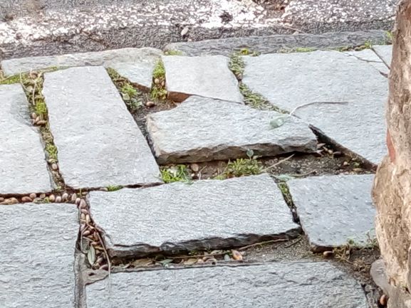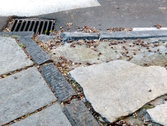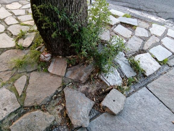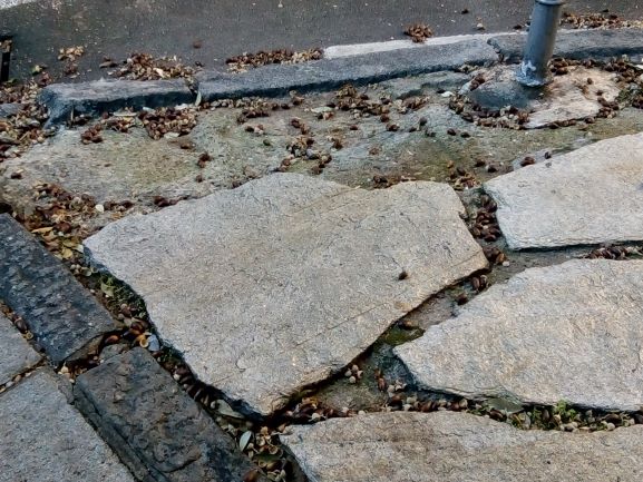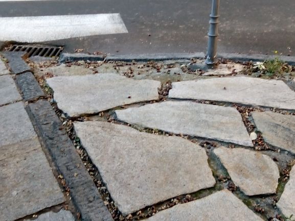Le lastre di pietra, probabilmente anche a causa dell’azione delle radici degli alberi, sono in alcui punti disconnesse con evidente rischio di inciampo e cadute, oltre a rendere difficoltoso il passaggio con passeggini e simili.