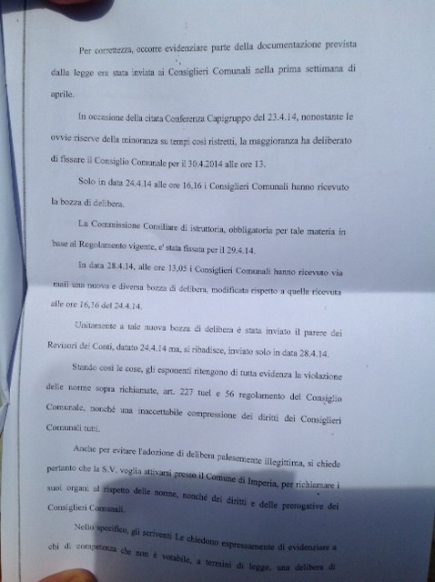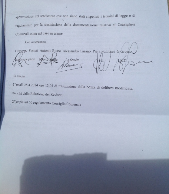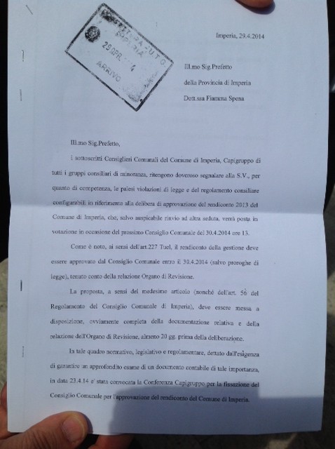 Imperia – Colpo di scena, questo pomeriggio, all’inizio della commissione bilancio del Comune di Imperia in cui è stata discussa, in vista del consiglio comunale di domani, la pratica relativa al rendiconto finanziario del 2013. La minoranza consiliare ha posto una questione preliminare informando i presenti di essersi recata, questa mattina, in Prefettura per denunciare la mancata osservanza del regolamento sulle tempistiche di invio delle pratiche ai consiglieri comunali.