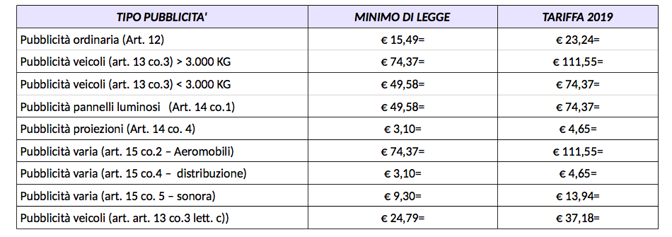 Le tariffe dell’Imposta Comunale sulla Pubblicità relative all’anno 2019 – per mq e per anno solare – saranno le seguenti: