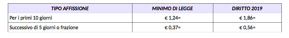 Il diritto sulle pubbliche affissioni per ciascun foglio 70×100 relativo all’anno 2019 è il seguente: