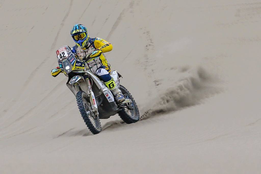 “E’ stata una giornata molto dura con l’immancabile fesh-fesh che non lasciava scampo, avevo ottime sensazioni ed ho provato ad alzare il ritmo che sapevo era nelle mie possibilità e così ho fatto, peccato un piccolo errore in uno di questi buchi di fesh che sembrava calce bianca, dove ho sentito andare via l’avantreno dopo aver urtato qualcosa di nascosto sotto il polverone, facendomi perdere il controllo e buttandomi a terra senza nessuna conseguenza per fortuna, vista anche la velocità ridotta. Bene così, mancano solo due tappe e spero di portare la moto la dove mi sono prefisso; Lima” , così Maurizio Gerini alla fine della speciale che terminava dopo un lungo plateau di dura consistenza dove tutti i mezzi sfrecciavano ad alta velocità nel caldo peruviano.