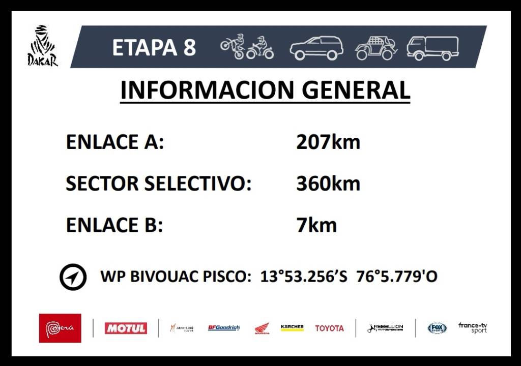 Dopo aver lasciato la cittadina di San Juan de Marcona sulla costa, la carovana della Dakar fa ritorno a Pisco dove, con un pò di “monotonia” ritroviamo lo stesso bivacco dello Stage 2, anche i piloti lamentano di passare sulle stesse tracce delle speciali precedenti ed anche oggi sono segnalate dune altissime e in quantità; il 40% del percorso su sabbia e il restante 60% su terreni duri con molte pietre, per un totale di 95% di off-road.