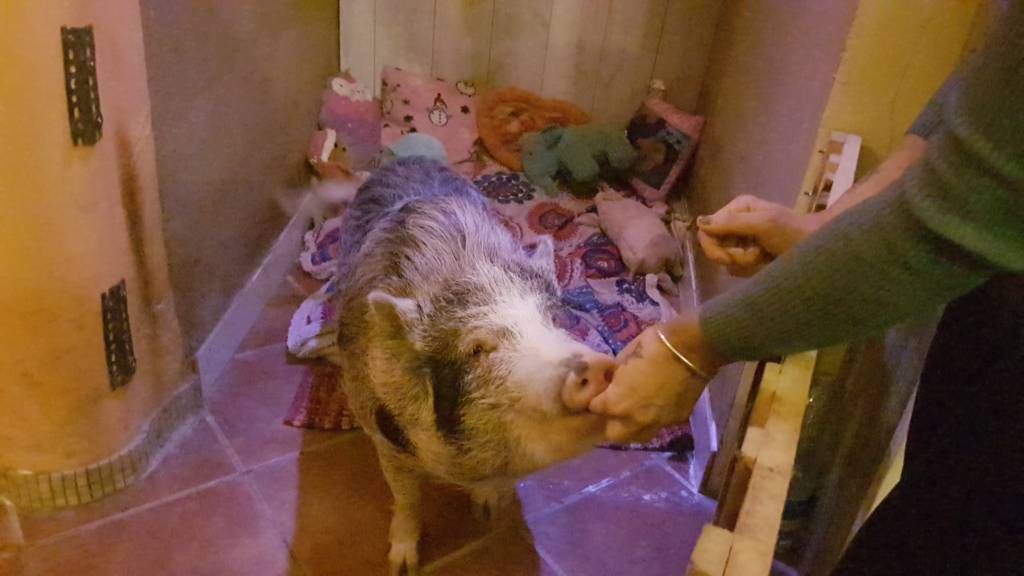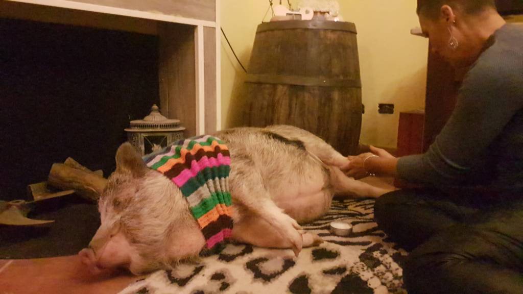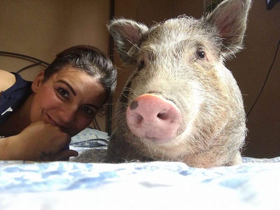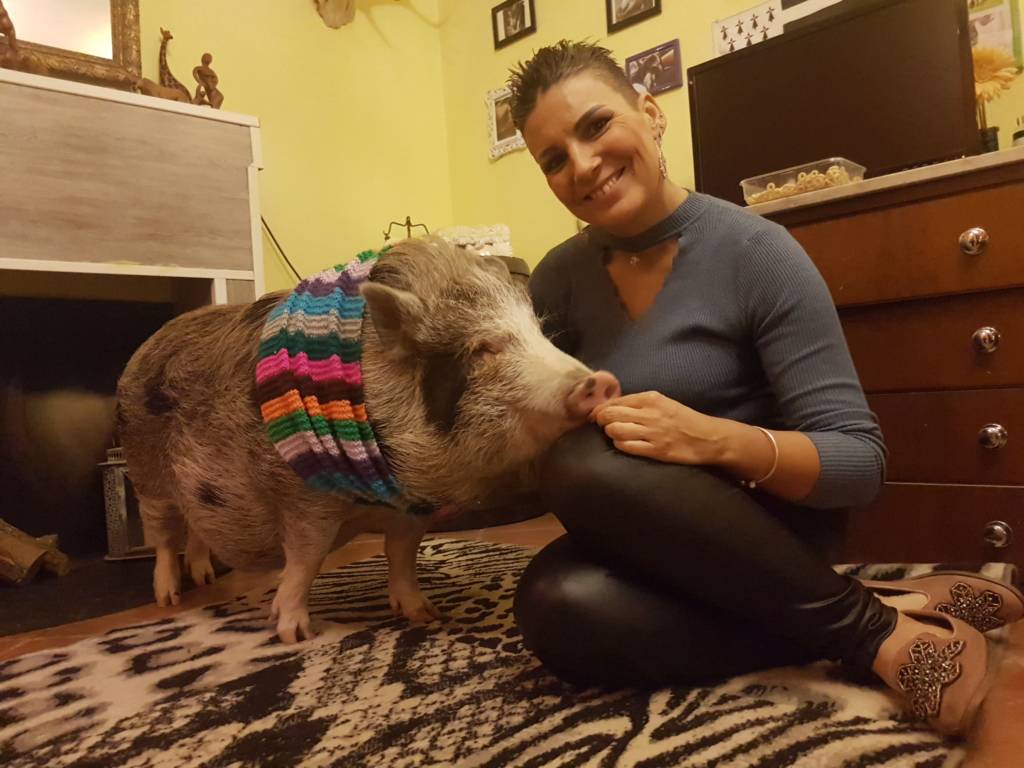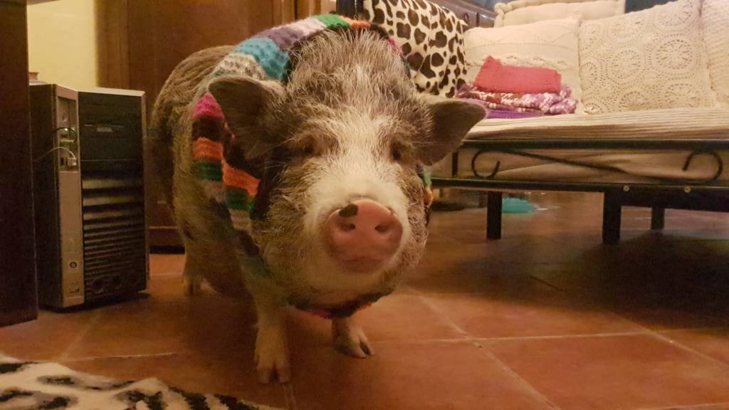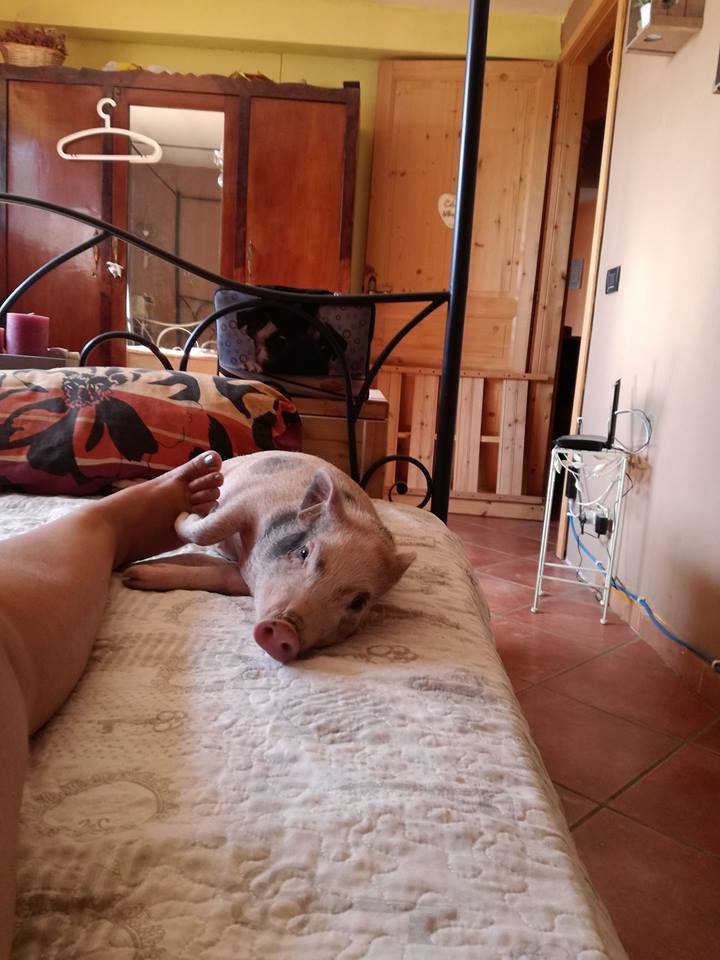 “Non molto diverso da avere un cane, a dir la verità. Dorme nella sua “cameretta” in casa con me, la faccio uscire in giardino, facciamo lunghe passeggiate e giochiamo insieme. Alla sera la spazzolo, le do l’olio per la pelle secca e la coccolo. Per lei creo anche delle sciarpine di lana, per tenerle calda la “coppa”, ovvero la nuca. Ha un carattere molto forte, quindi bisogna darle delle regole, ma è molto intelligente. I maiali hanno l’intelligenza di un bambino di 4 anni”.