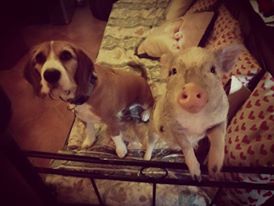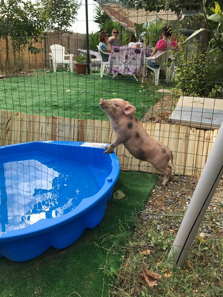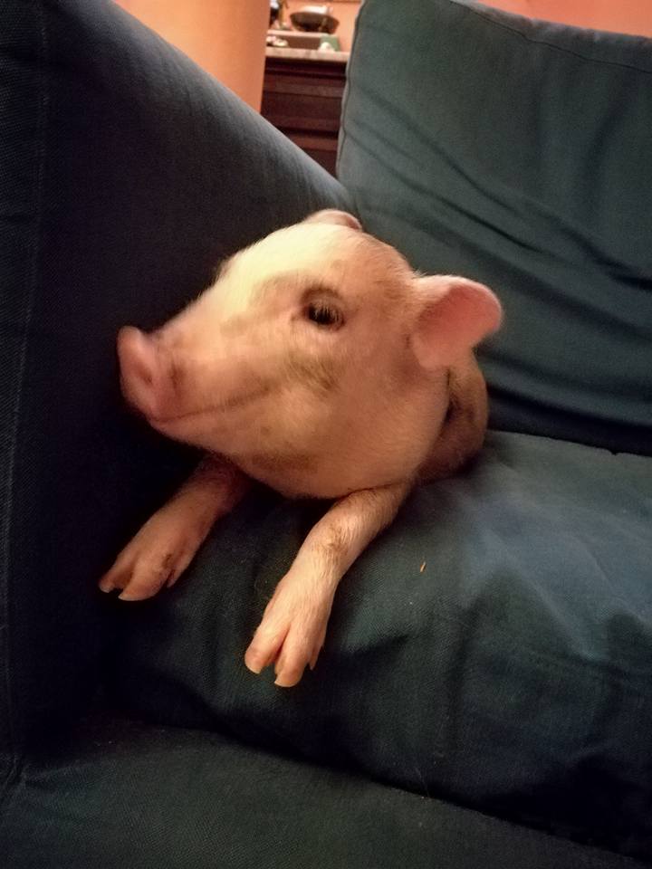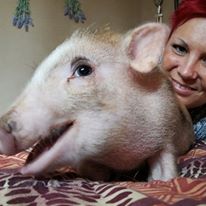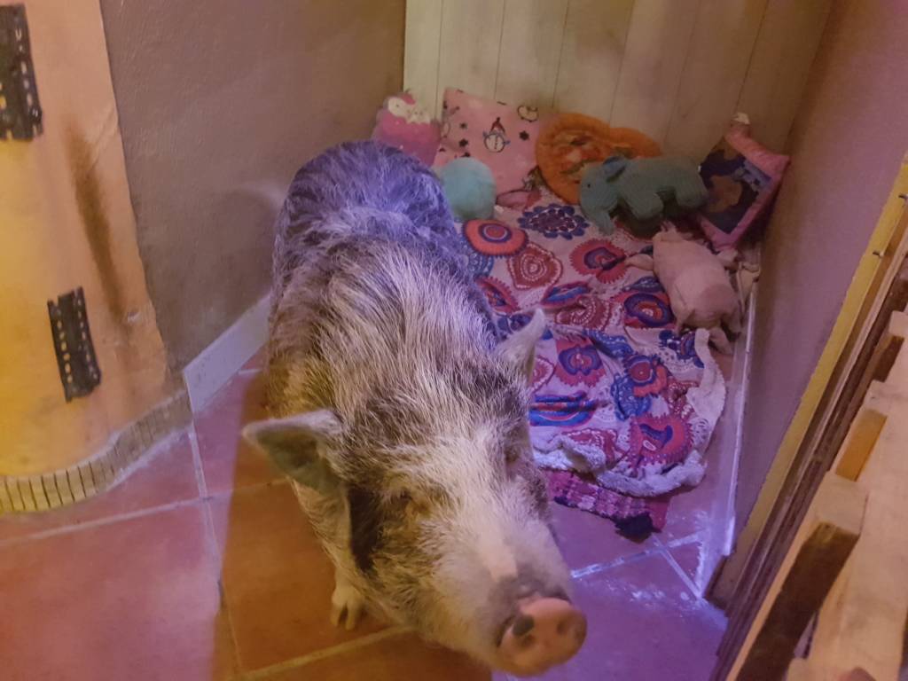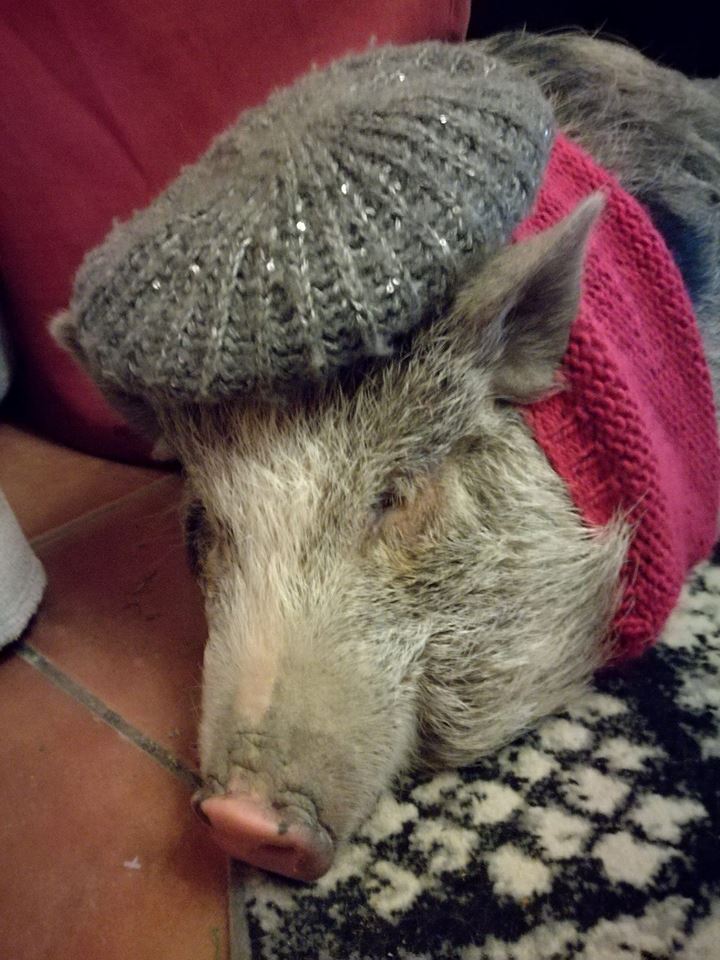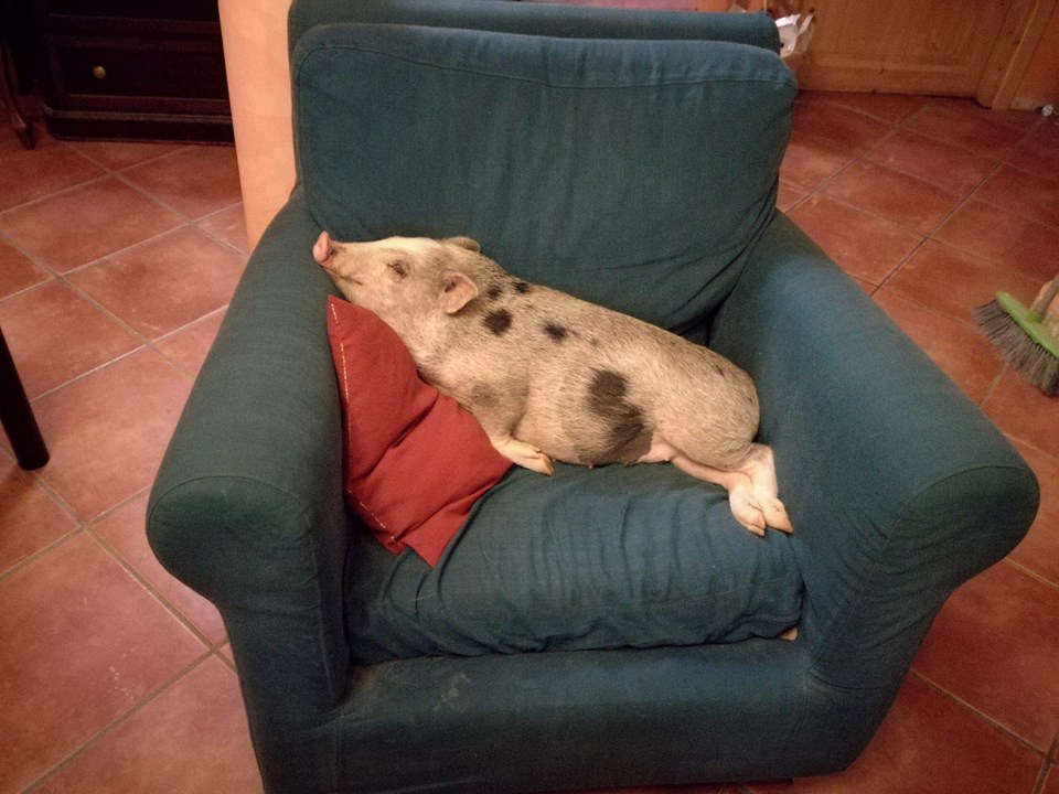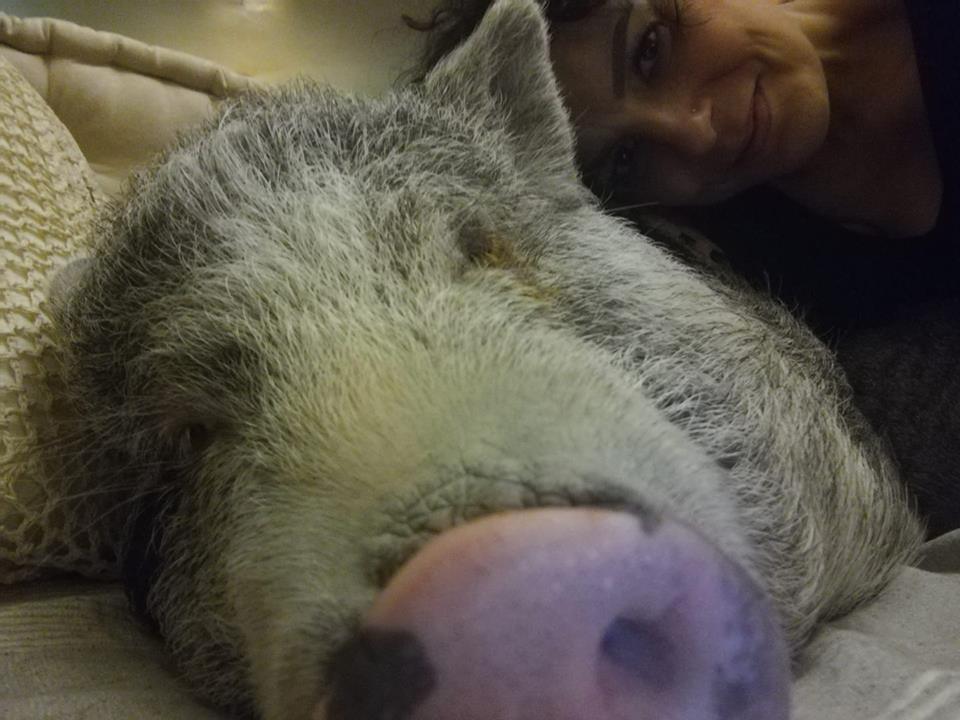 “Non molto diverso da avere un cane, a dir la verità. Dorme nella sua “cameretta” in casa con me, la faccio uscire in giardino, facciamo lunghe passeggiate e giochiamo insieme. Alla sera la spazzolo, le do l’olio per la pelle secca e la coccolo. Per lei creo anche delle sciarpine di lana, per tenerle calda la “coppa”, ovvero la nuca. Ha un carattere molto forte, quindi bisogna darle delle regole, ma è molto intelligente. I maiali hanno l’intelligenza di un bambino di 4 anni”.