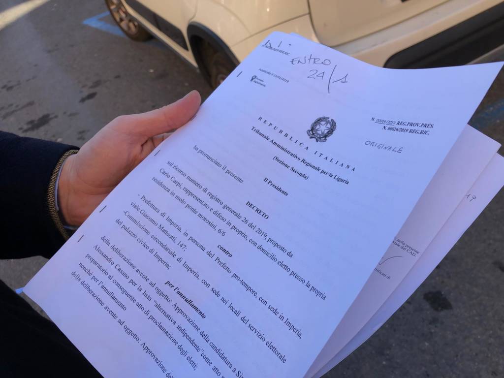 Nei giorni scorsi, Carpi, ha presentato un ricorso al T.A.R. Liguria sostenendo presunte irregolarità negli atti propedeutici alla presentazione delle liste elettorali chiedendo l’annullamento del voto imperiese. Questa mattina Carpi si è presentato all’Unep (Ufficio notifiche esecuzioni e protesti) per ritirare gli originali delle notifiche del ricorso presentato al tribunale genovese.