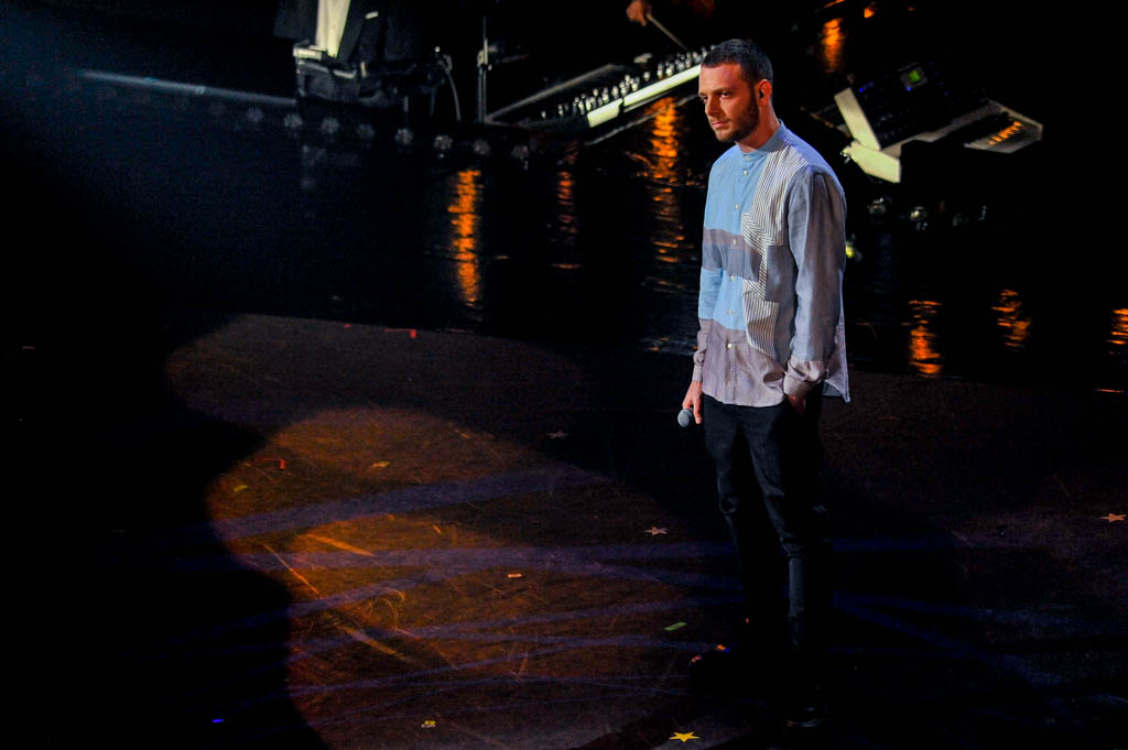 Per la prima volta si sente una lingua straniera sul palco dall’inizio del Festival. Quando tutti ormai si aspettano il terzo abbraccio nel pubblico alla fine della canzone, ecco che stupisce di nuovo, abbracciando il suo compagno di duetto.