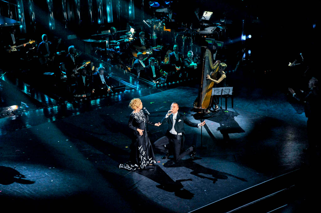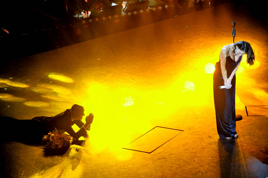 Per reggere al paragone con l’energia della Bertè, Renga doveva inventarsi qualcosa. Così coinvolge una ragazza del pubblico, con qualche incertezza.