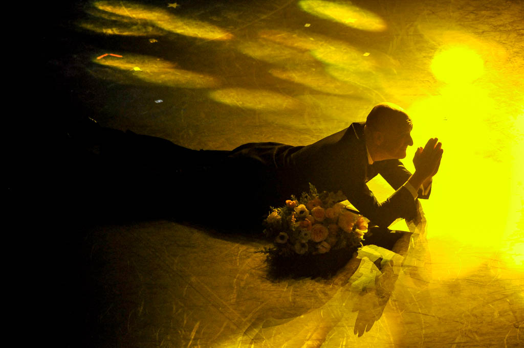 La sua esitazione fa irrompere sul palco Bisio prima del previsto, il quale, quando si rende conto dell’errore, si butta per terra.