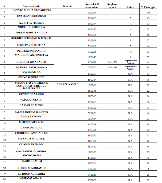 - in caso di parità di posizione si farà ricorso al criterio sussidiario dell’anzianità di iscrizione quale imprenditore commerciale su aree pubbliche nel registro delle imprese tenuto dalle Camere di Commercio;
