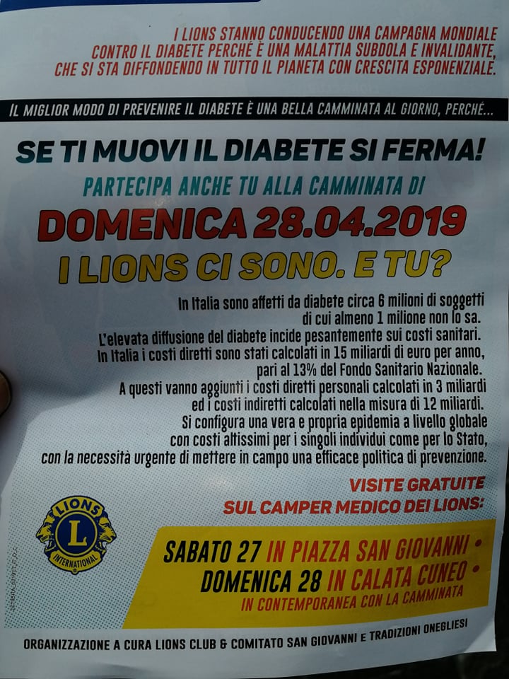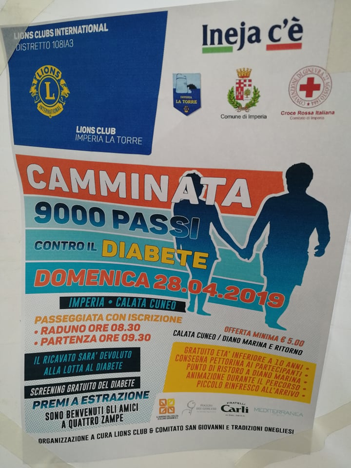 Una camminata di 9 mila passi, da Calata Cuneo a Diano Marina (e ritorno), contro il diabete. Questa l’iniziativa promossa dal Club Lione Imperia-La Torre, in collaborazione con il Comitato San Giovanni. L’evento, organizzato nell’ambito delle giornate della salute, si terrà domenica 28 aprile.