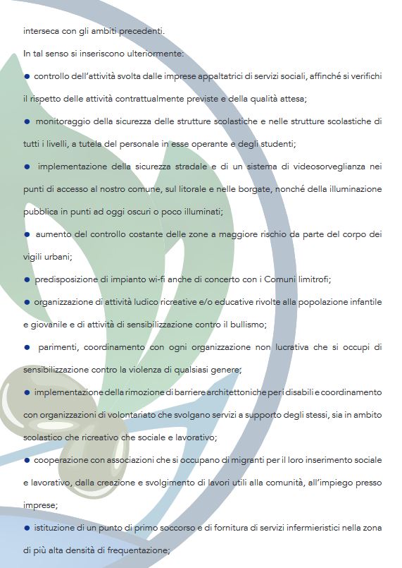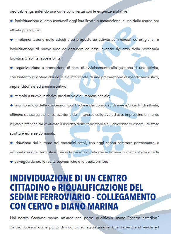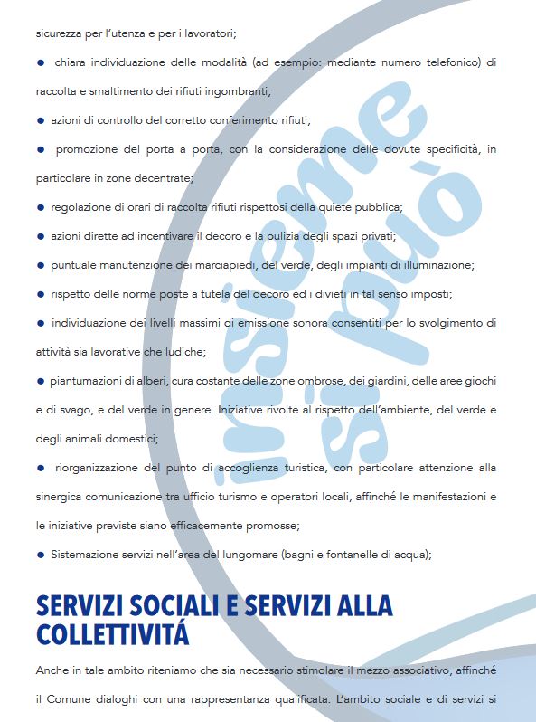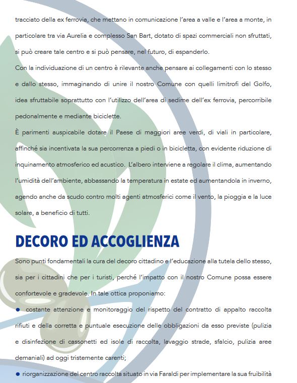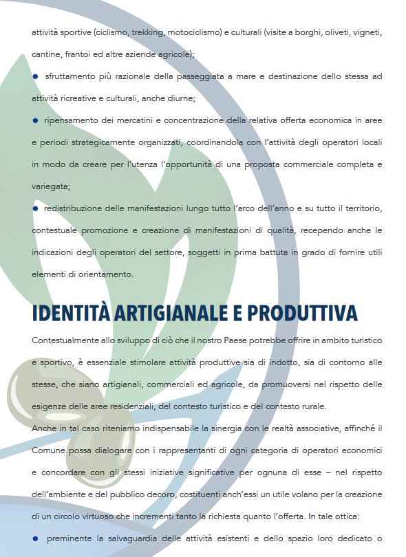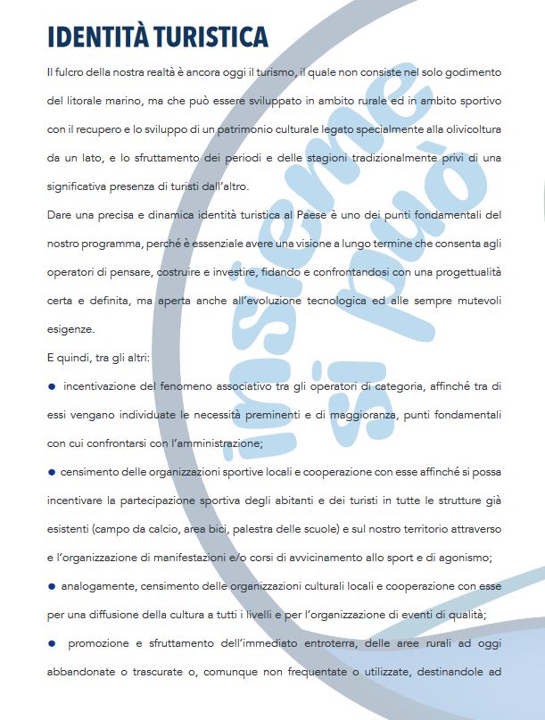 Pensiamo che per la salvaguardia del nostro comune sia necessario trovare un’identità turistica che dia agli operatori la garanzia di poter investire garantendosi un ritorno. Vogliamo puntare sulle attività che si possono fare anche fuori stagione, sfruttando il nostro clima per organizzare manifestazioni per tutto l’anno, rilanciando la nostra economia ormai allo stremo.