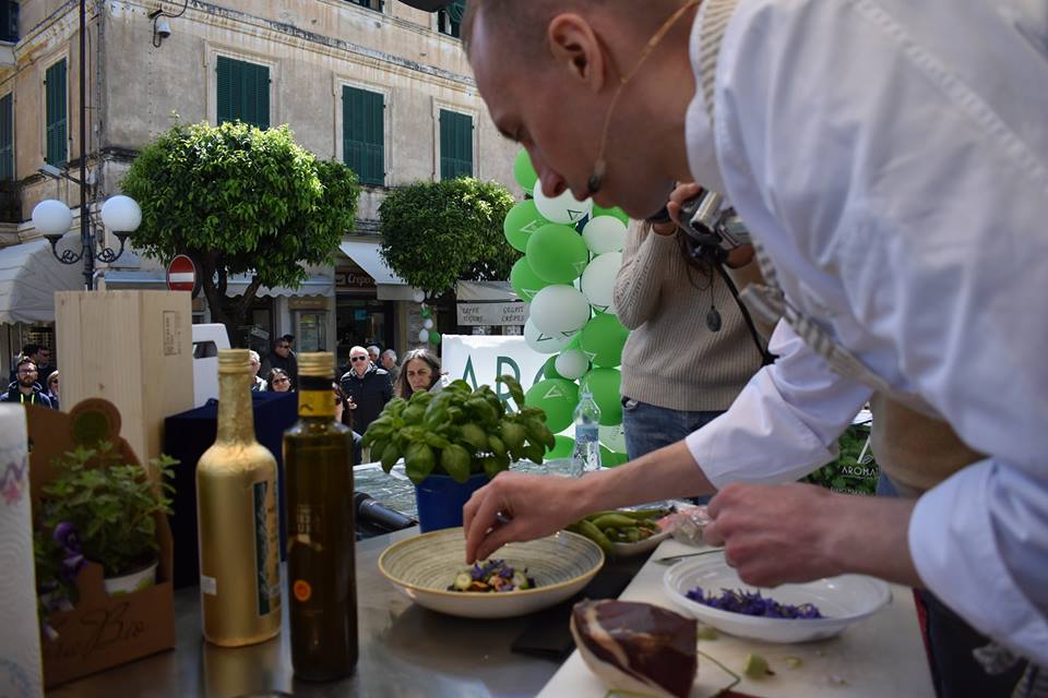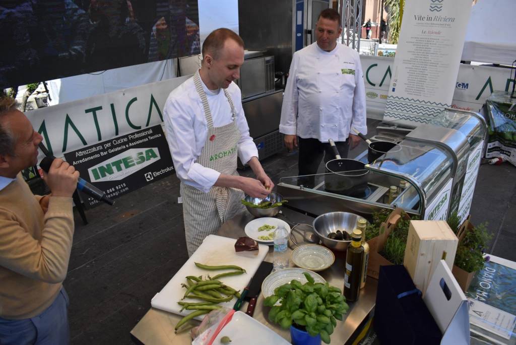 Giuliano (“A Parigi per tutti sono lo Chef, ma qui sono Giuliano“) ha commosso la platea di Aromatica, con parole semplici e molto intense, nelle quali ha ricordato le sue radici e quelle della sua famiglia. Ha anche spiegato che nel suo lavoro (“che ho la fortuna di fare, divertendomi molto”) porta ogni giorno tutta la sua identità, il suo essere figlio di questa terra dove, oltre a olio, olive, basilico, pesto, nascono fiori e erbe aromatiche in modo spontaneo: “Come quel fiore che ho raccolto questa mattina in una fascia, che mi serve per decorare e finire il piatto che preparerò durante lo show cooking”.