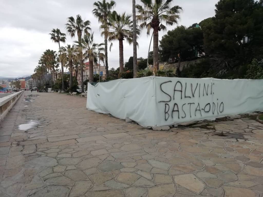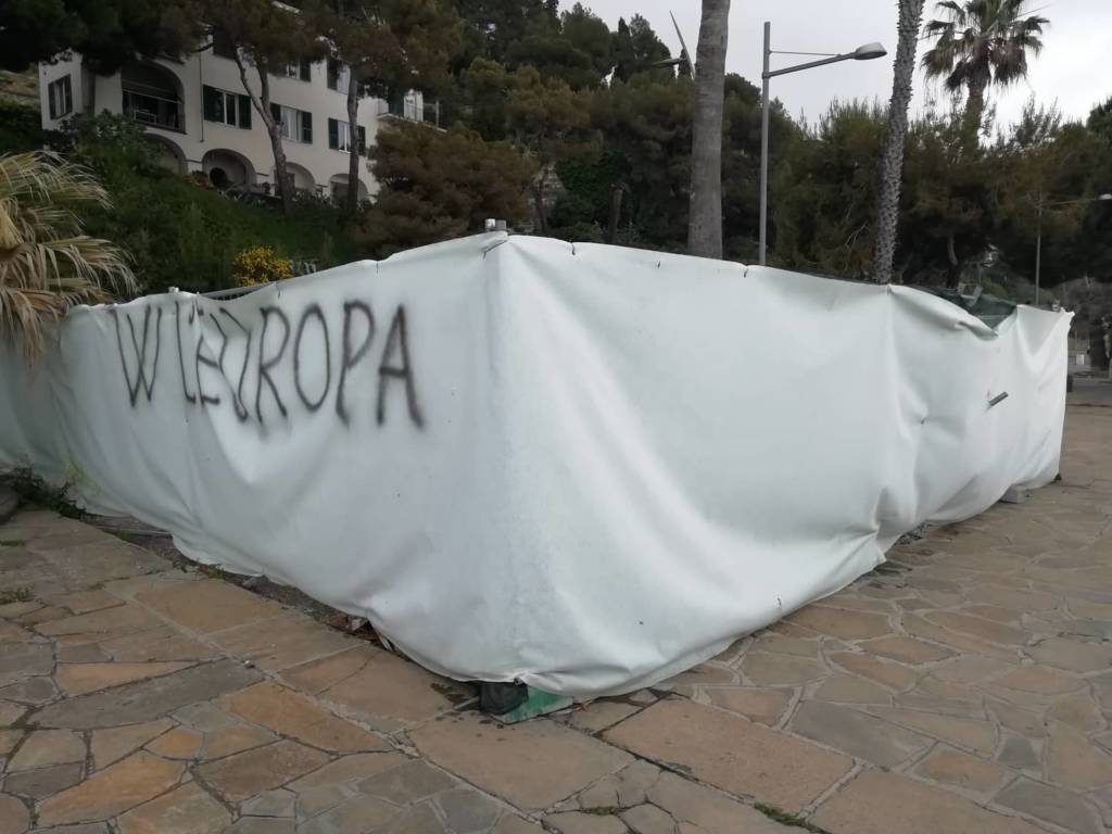 “Salvini basta odio, W l’Europa”. Così recita la scritta comparsa sui teli a copertura del cantiere lungo Spianata Borgo Peri a Imperia.
