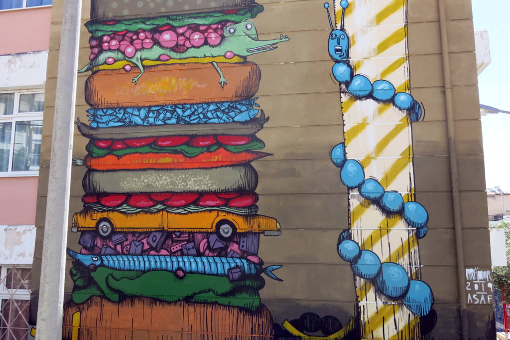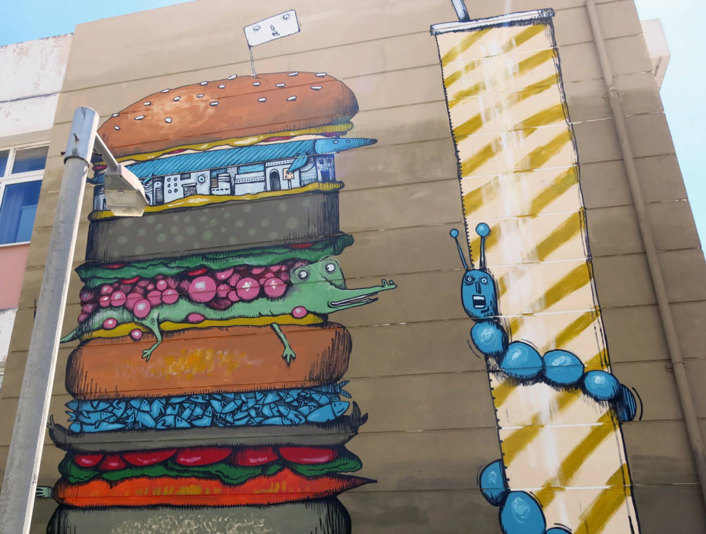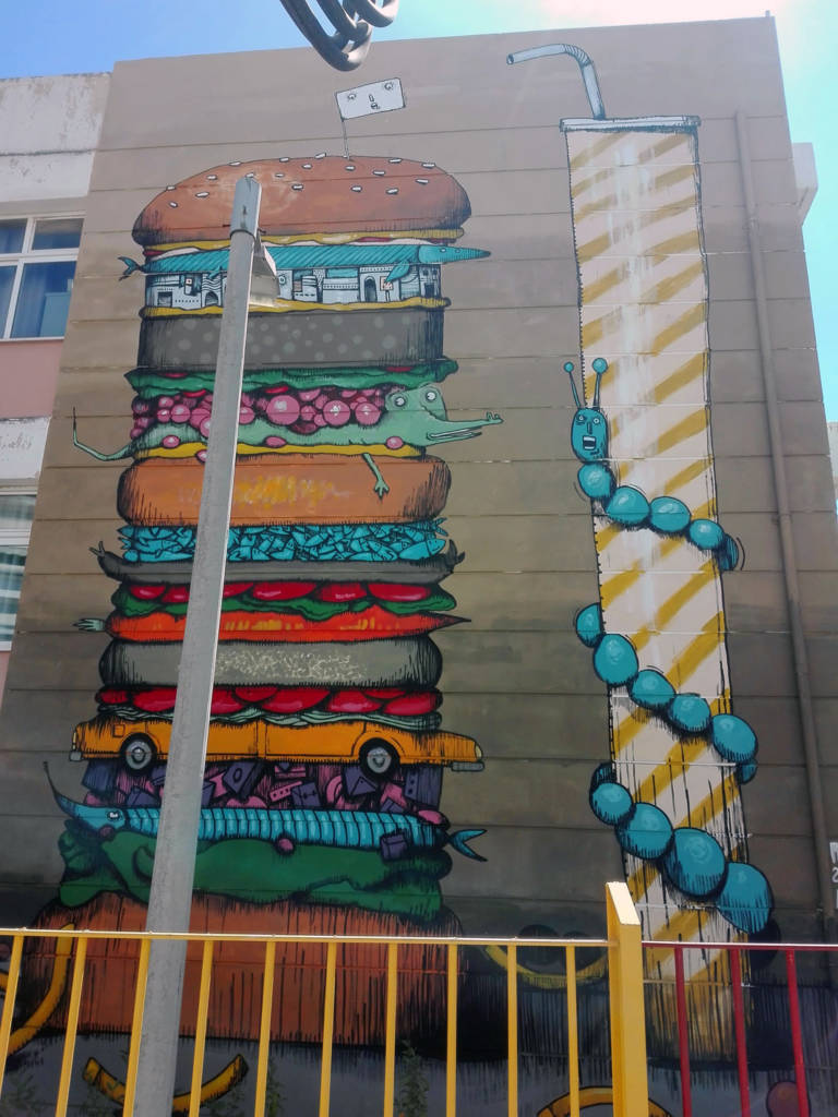 Un hamburger taglia xxxl con tanti strati quanti i nostri sogni (sembrerebbe), ove tra una fetta di formaggio e l’insalata spuntano città e animali. Uno spaccato visionario della nostra quotidianità, dalle forme grasse e non troppo succulente.