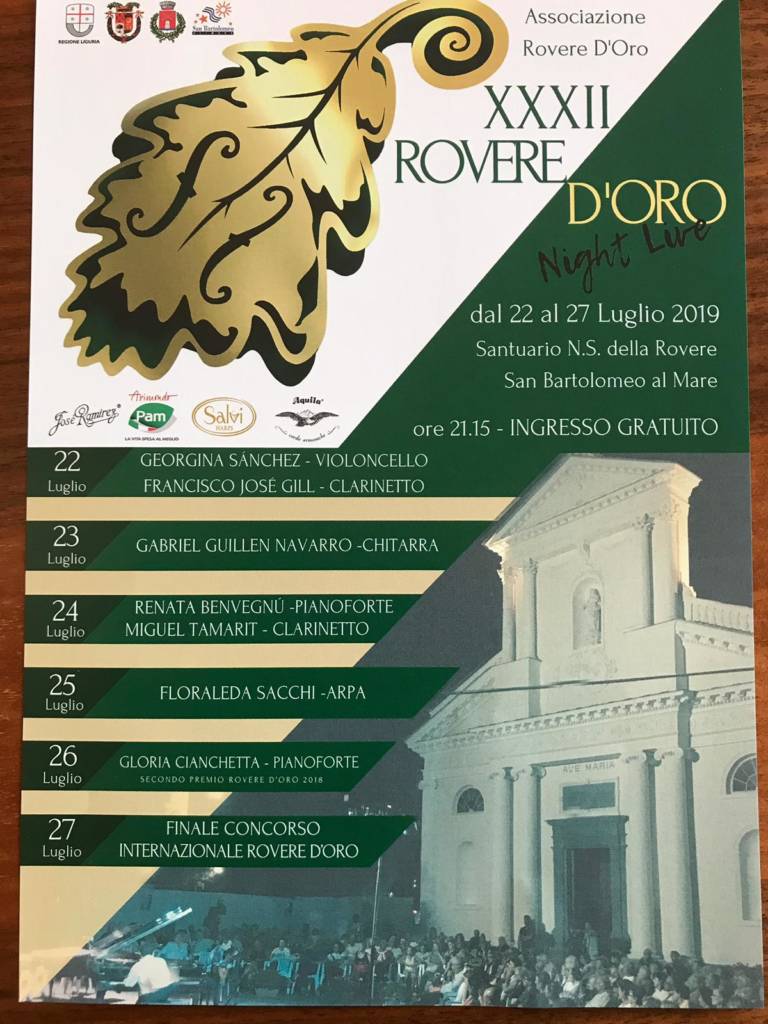 I concerti dei maestri inizieranno il 22 luglio, con ingresso gratuito sul Sagrato di N.S. della Rovere a San Bartolomeo: Giorgina Sanchez Torres e Francisco Josè Gil Ortiz, violoncello e clarinetto, con un programma davvero incredibile dedicato alla musica spagnola, il 23 Gabriel Guillen Navarro, uno dei più grandi chitarristi che abbiamo al mondo. Il 24 Renata Benvegnù e Miguel Tamarit, clarinetto e pianoforte, con in programma un gran repertorio per questo duo, il 25 Florelada Sacchi, arpista e recentemente vincitrice di un Gremmy negli Stati Uniti , che ci verrà a trovare per la seconda volta. Il 26 abbiamo Gloria Cianchetta al piano forte che è la premiata Rovere D’Oro dell’anno scorso e il 27 il finale del concorso che sarà in forma pubblica e quindi sarà asportabile da tutti quelli che vorranno venire.