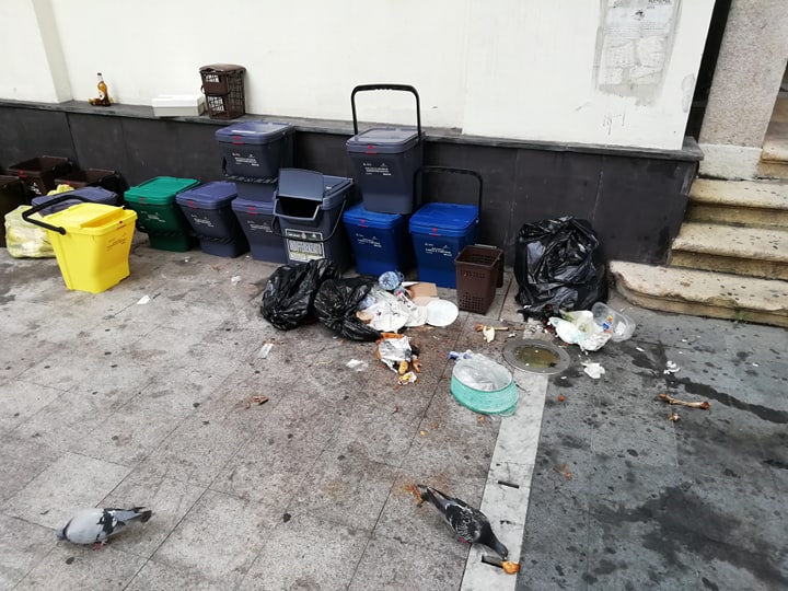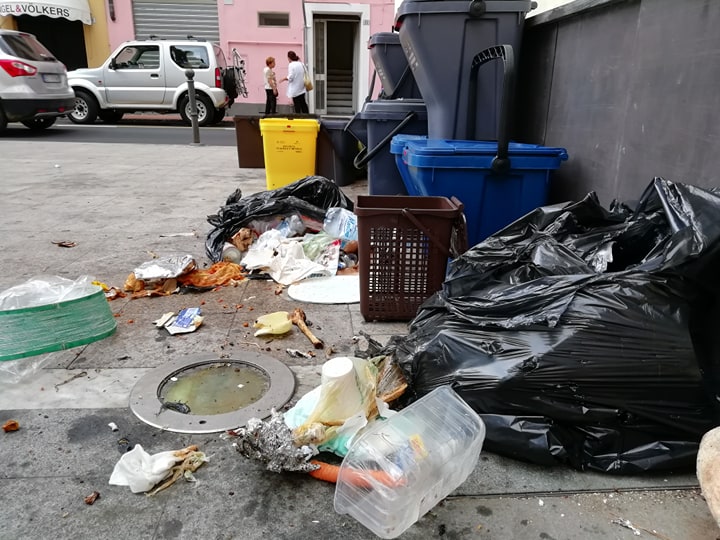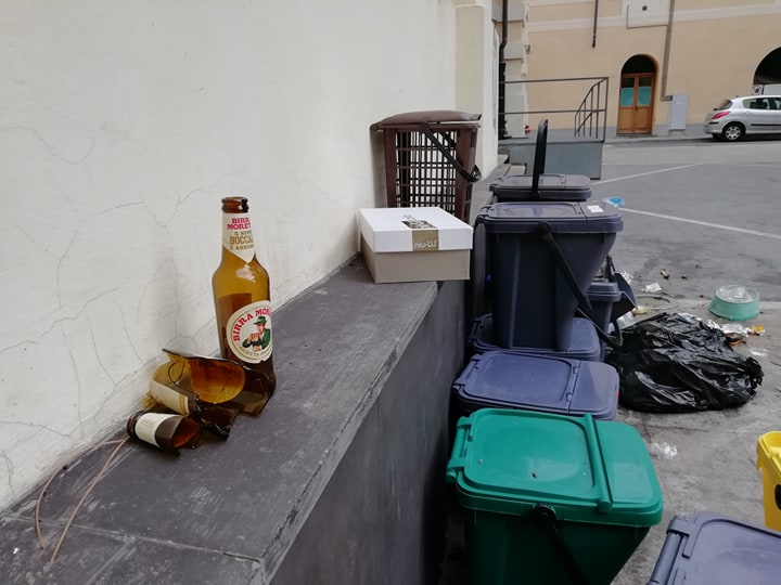 È un triste spettacolo quello a cui hanno dovuto assistere questa mattina i passanti in piazza San Francesco. Questa mattina, proprio davanti all’ingresso della Biblioteca Lagorio, dove è presente un punto di raccolta mastelli, sono presenti numerosi sacchi fuori dai contenitori e alcuni risultano aperti. Il contenuto è finito sparso a terra, forse per opera dei gabbiani. Presenti anche bottiglie di vetro rotte e abbandonate a terra.