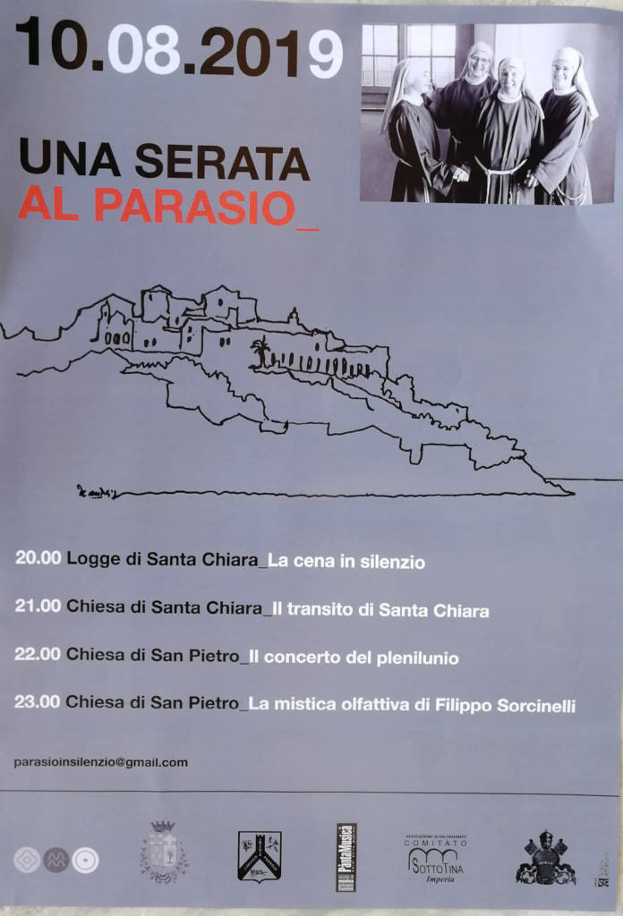 “Per rendere Imperia viva e animare Borgo Parasio, una cosa nuova originale, studiata in collaborazione con il maestro Settimio Benedusi, in piena sintonia con l’Amministrazione, in collaborazione con il comitato Sottotina, il Circolo Parasio e la scuola Panta Musica, per organizzare una sera al Parasio particolare, dove si sarà appagata dai sensi, una cena fatta in silenzio, un programma vasto, non solo caratterizzato dai prodotti tipici, ma godendosi anche una vista meravigliosa alle Logge di Santa Chiara.