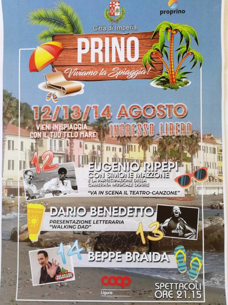 “Tre giorni in spiaggia con teatro, musica, cabaret e libri. Il primo giorno ci sarà la serata “Va in scena il Teatro-Canzone”, con la partecipazione camerata musicale ligure e Simone Mazzone. Il 13 ci sarà Davide Benedetto per una presentazione letteraria umoristica e il 14 arriverà Beppe Braida.