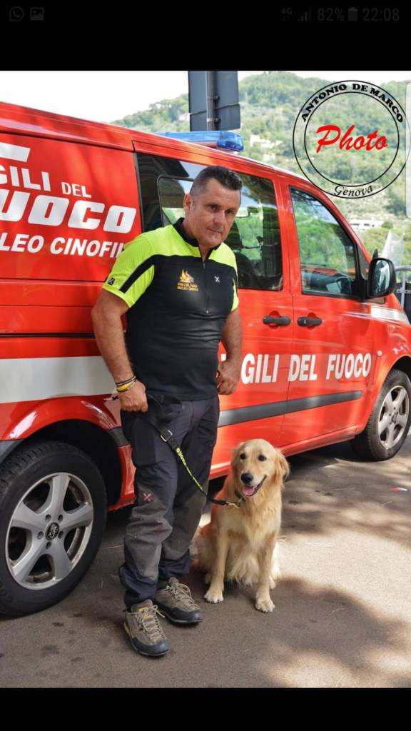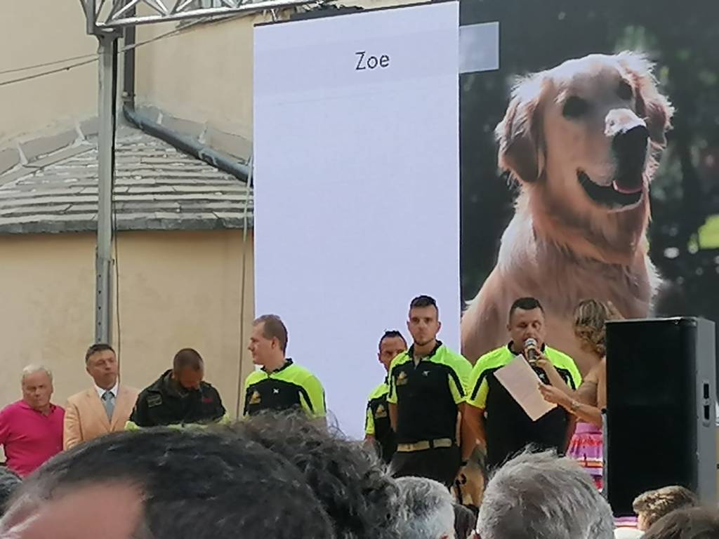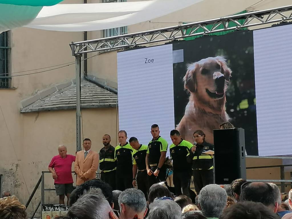 È stato consegnato il Premio “Fedeltà” a Zoe, la Golden Retriever che, insieme al Vigile del Fuoco imperiese Rocco Tufarelli, è stata tra i soccorritori a scavare nelle macerie del Ponte Morandi crollato a Genova il 14 agosto 2018.