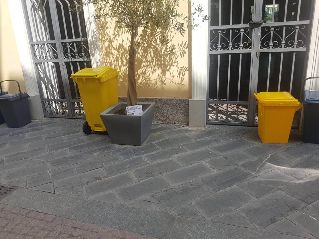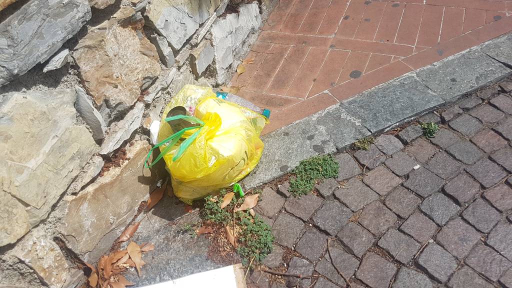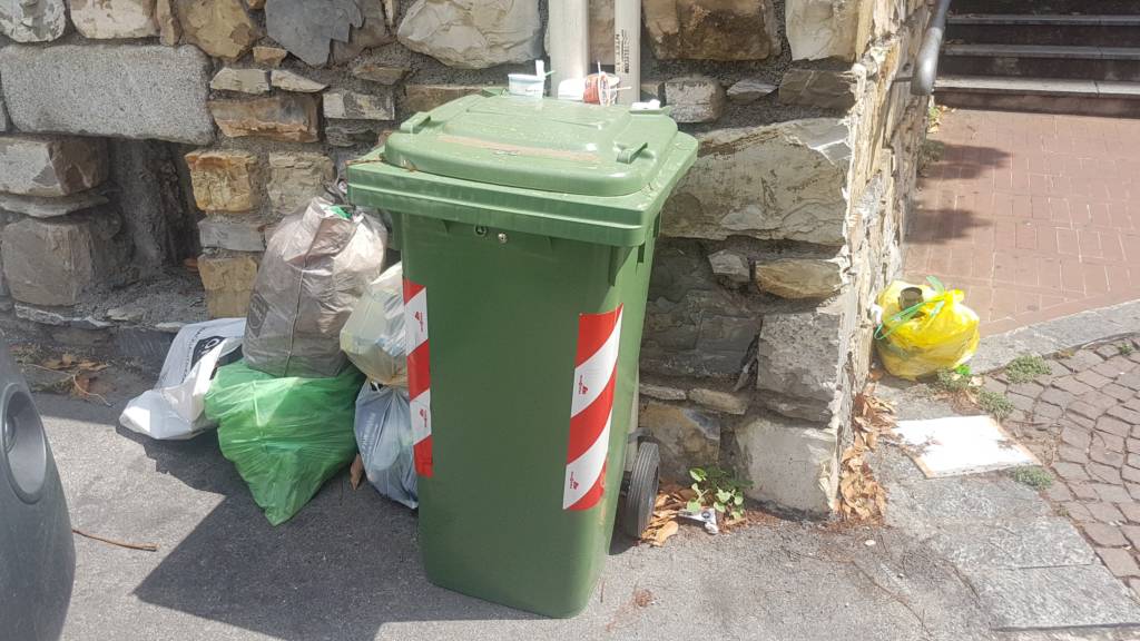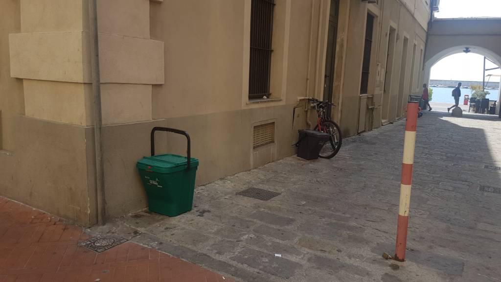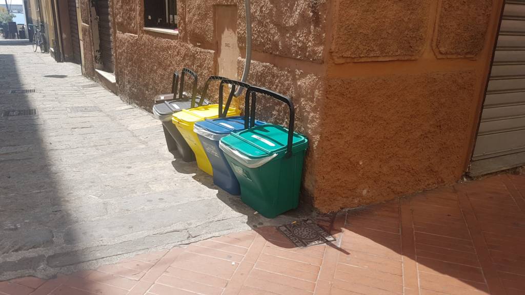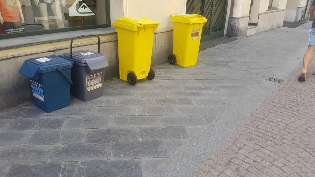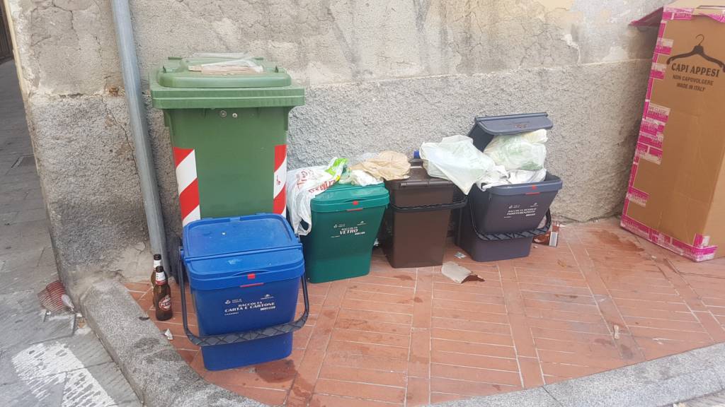 Ore 12.30, cuore pedonale di Oneglia, domenica 18 agosto. In ogni angolo si possono facilmente notare, anche grazie ai loro colori sgargianti, i mastelli dedicati alla raccolta rifiuti, alcuni vuoti, alcuni pieni. Abbandonati vicino, inoltre, spesso si trovano anche sacchetti della spazzatura abbandonati da chi ancora non vuole arrendersi al nuovo servizio porta a porta, contribuendo all’immagine di degrado.