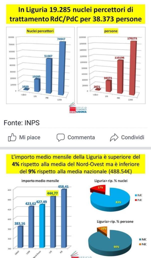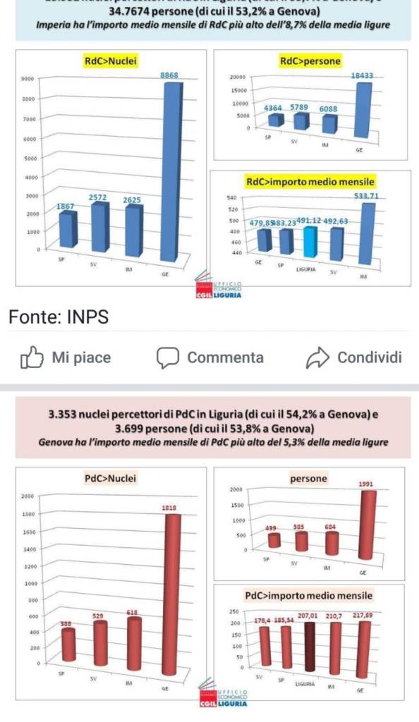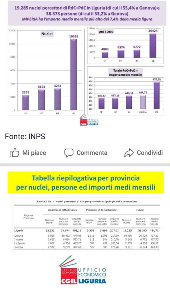 In particolare, a Genova sono 20.424 le persone che ricevono ogni mese il sussidio, per un importo medio mensile di 437,13 euro. A Imperia sono 6.772, per un importo mensile di 477,73 euro (l’importo più alto di tutta la Liguria).