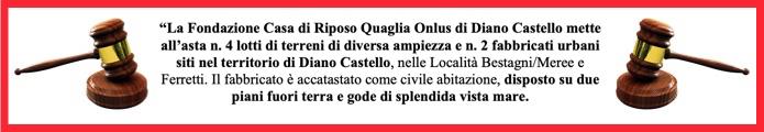 Che è indetto un pubblico incanto, da svolgersi col metodo delle offerte segrete, per l’alienazione dei seguenti immobili di proprietà della Fondazione Casa di Riposo Quaglia Onlus e siti in Diano Castello: