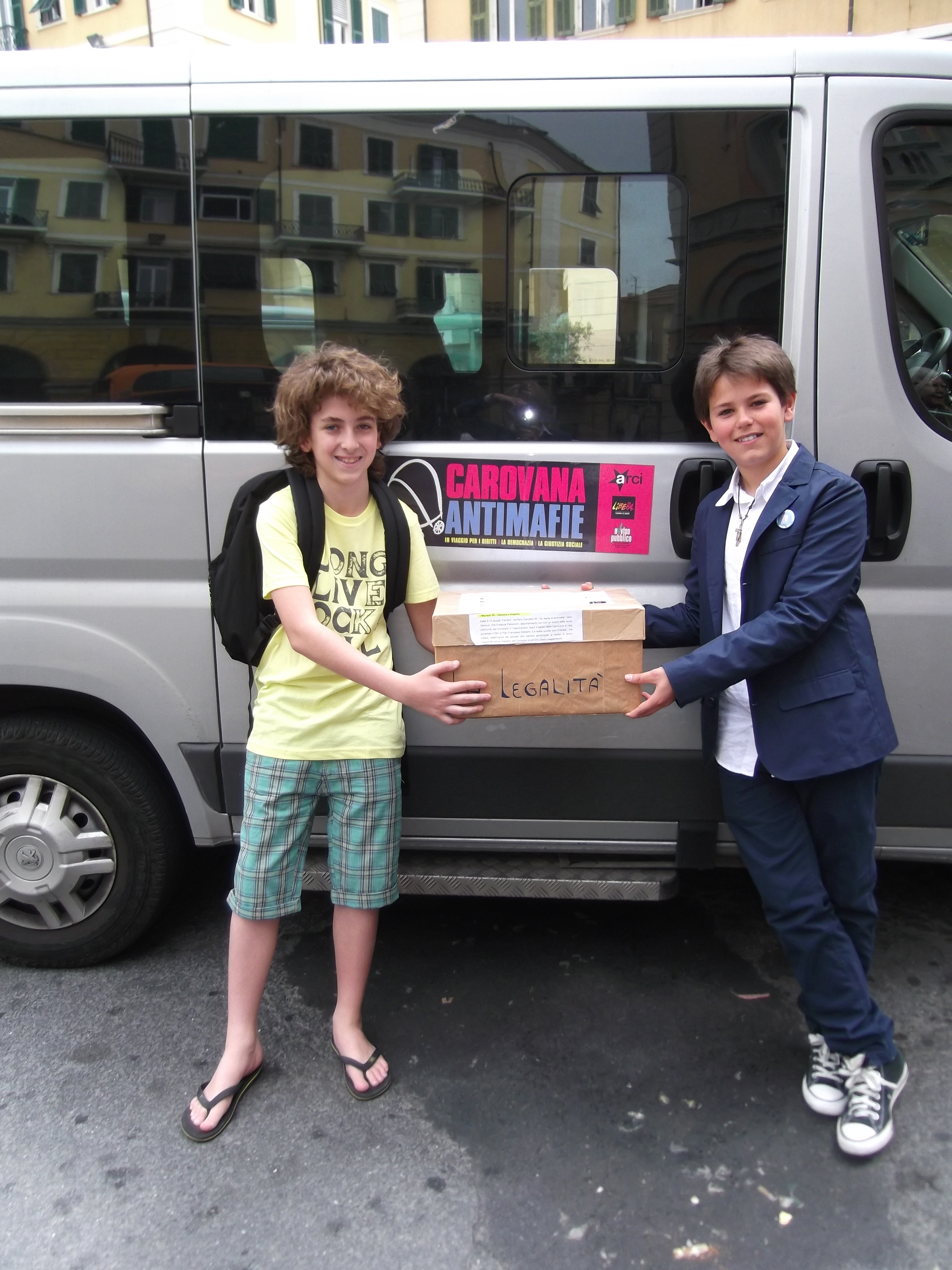 Due rappresentanti degli istituti sono andati in giro per la città, a bordo di due furgoni messi a disposizione dall’Arci di Genova, in rappresentanza della Carovana Nazionale Antimafie nata nel 1994 da un’idea dell’Arci Sicilia, con dieci giorni di viaggio da Capaci a Licata, attraversando il territorio con un percorso a tappe che, a un anno e mezzo dalle stragi di Capaci e via D’Amelio del 1992, si proponeva di portare solidarietà a coloro che in prima fila operavano per portare legalità democratica, giustizia e opportunità di crescita sociale nel proprio territorio, di sensibilizzare le persone per tenere alta l’attenzione sul fenomeno mafioso, di promuovere impegno sociale e progetti concreti.