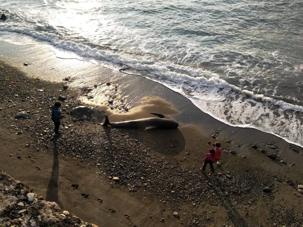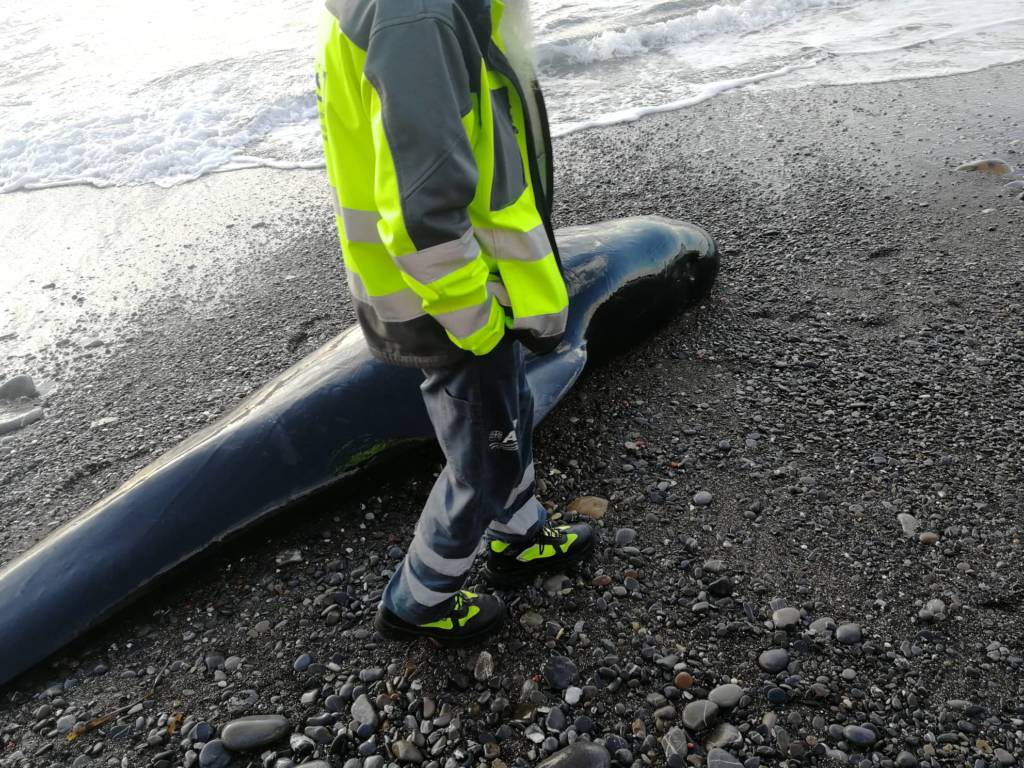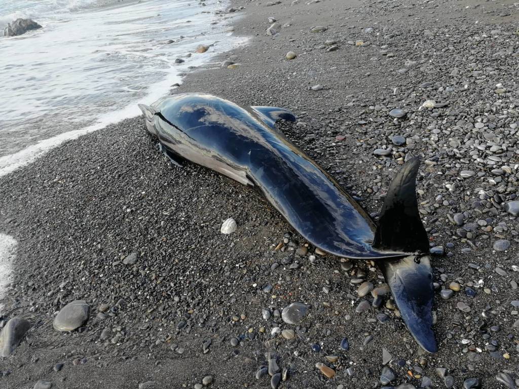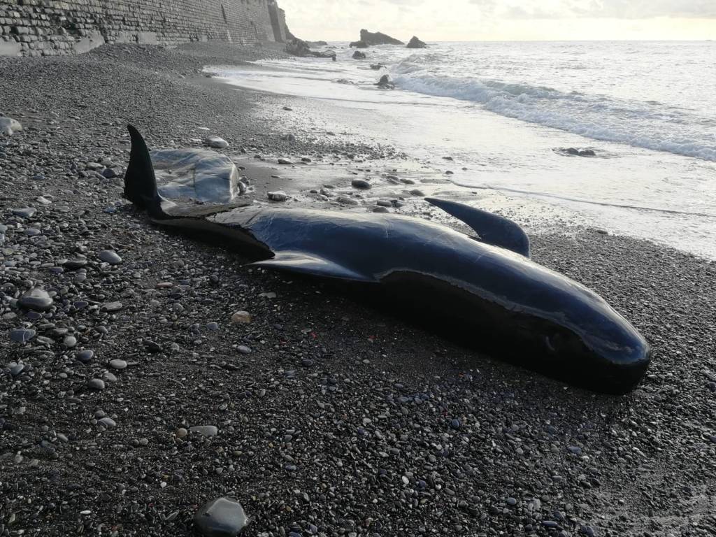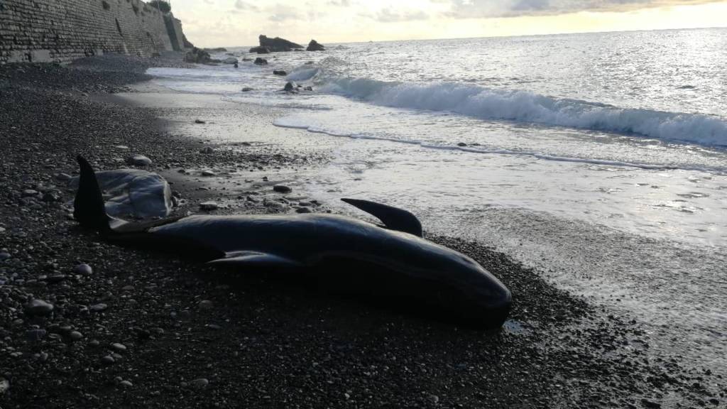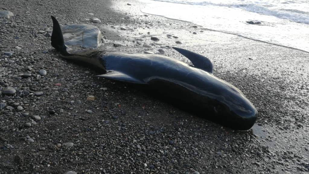 Globicefalo spiaggiato alla Galeazza. L’esemplare, lungo circa 3 metri, è stato trovato privo di vita questa mattina da alcuni passanti lungo il litorale di Oneglia.